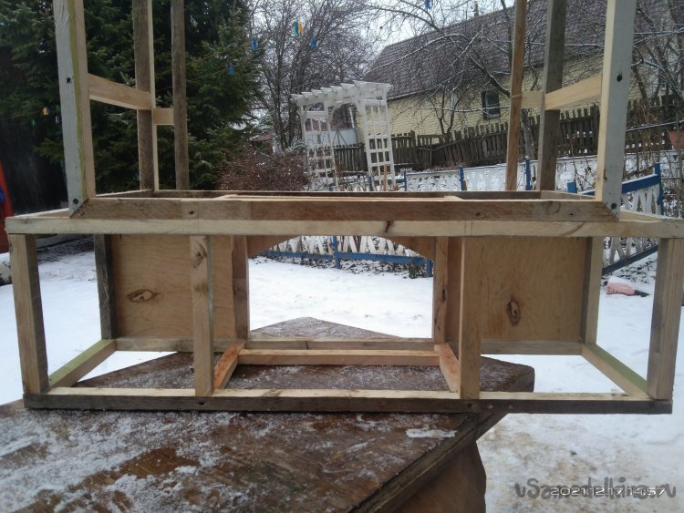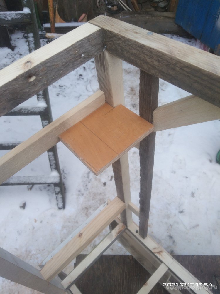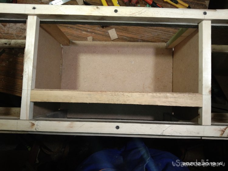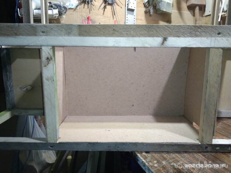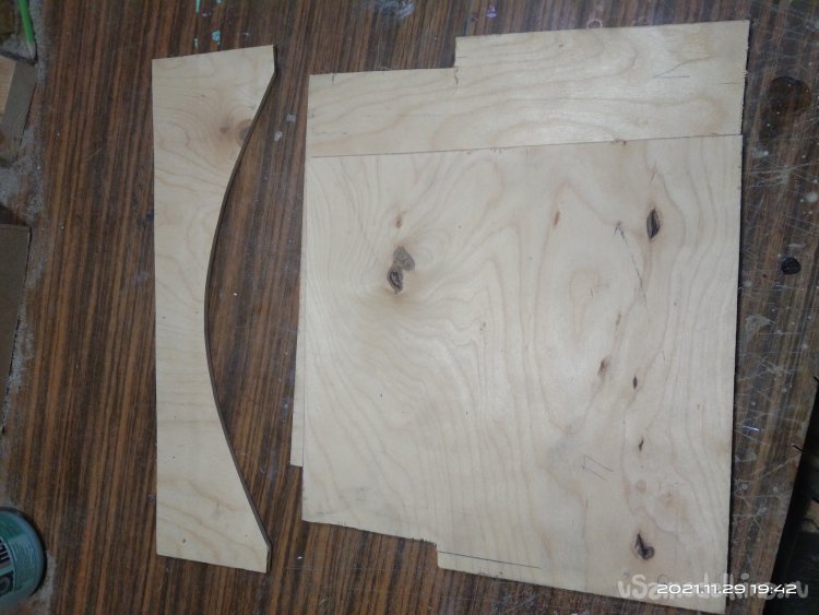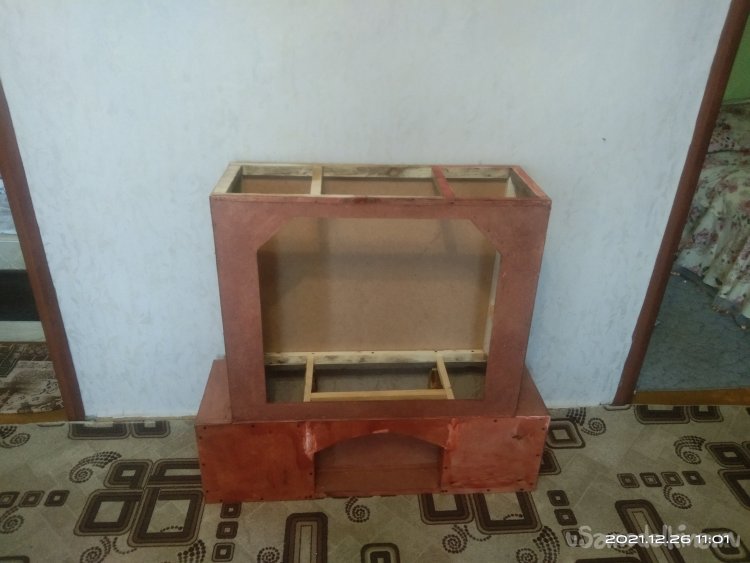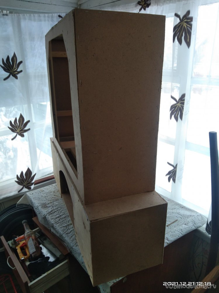 Когда с этой частью камина было закончено, начал обшивать переднюю часть. Для обшивки использовал фанеру в 4 мм. Вырезал полукруглую часть для портала и боковые стенки. Все это закрепил на основе саморезами. Затем закрепил верхнюю часть камина, квадратную, на нижнюю часть. Получилась готовая основа камина, уже вполне узнаваемая. В верхней части так же установил перемычки между стенками для удобного крепления обшивки и другие ребра жесткости. Так же с помощью брусков придал передней части вид полуарки, для обшивки. Из обрезка фанеры вырезал небольшую полочку во внутренней части камина. Она нужна для того, чтобы после того, как изделие будет готово и начнет работать, на нее можно было бы установить или положить какой-нибудь музыкальный гаджет, чтобы он проигрывал звуки костра, треск искр.
