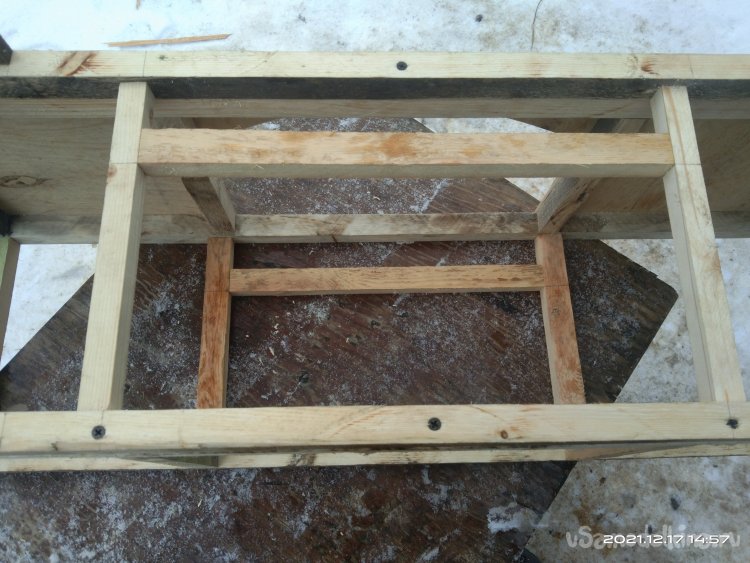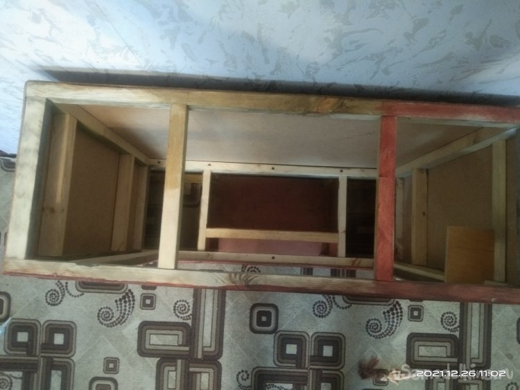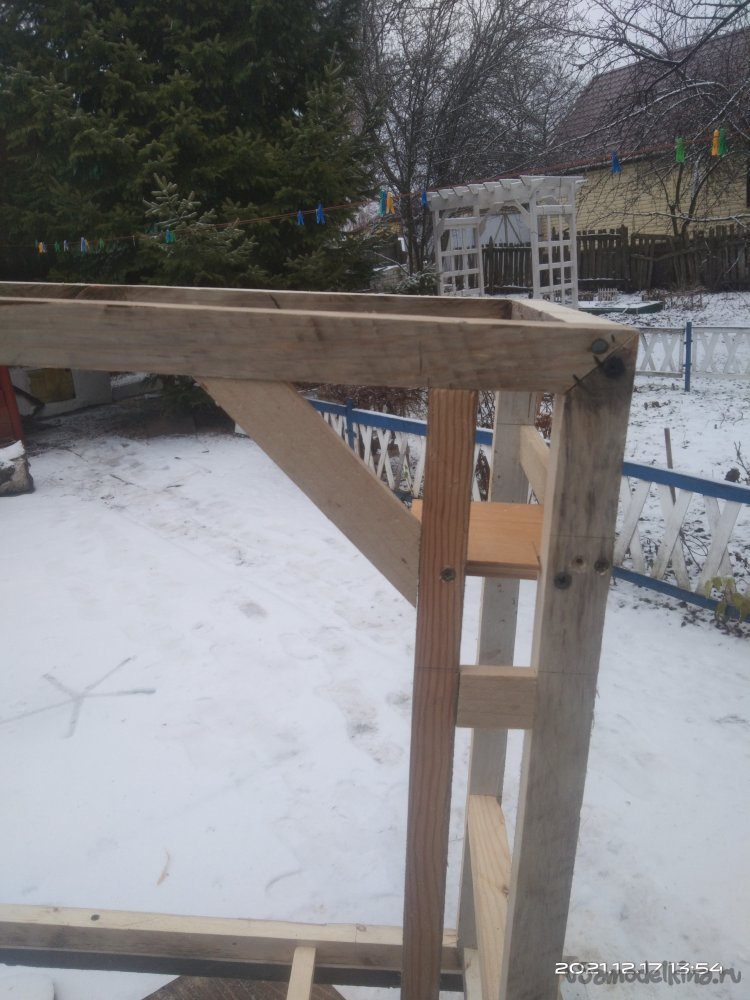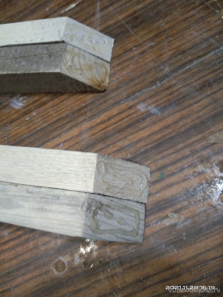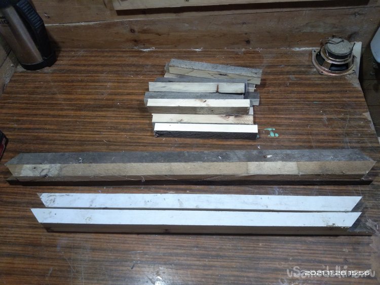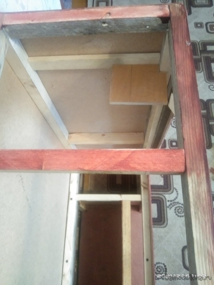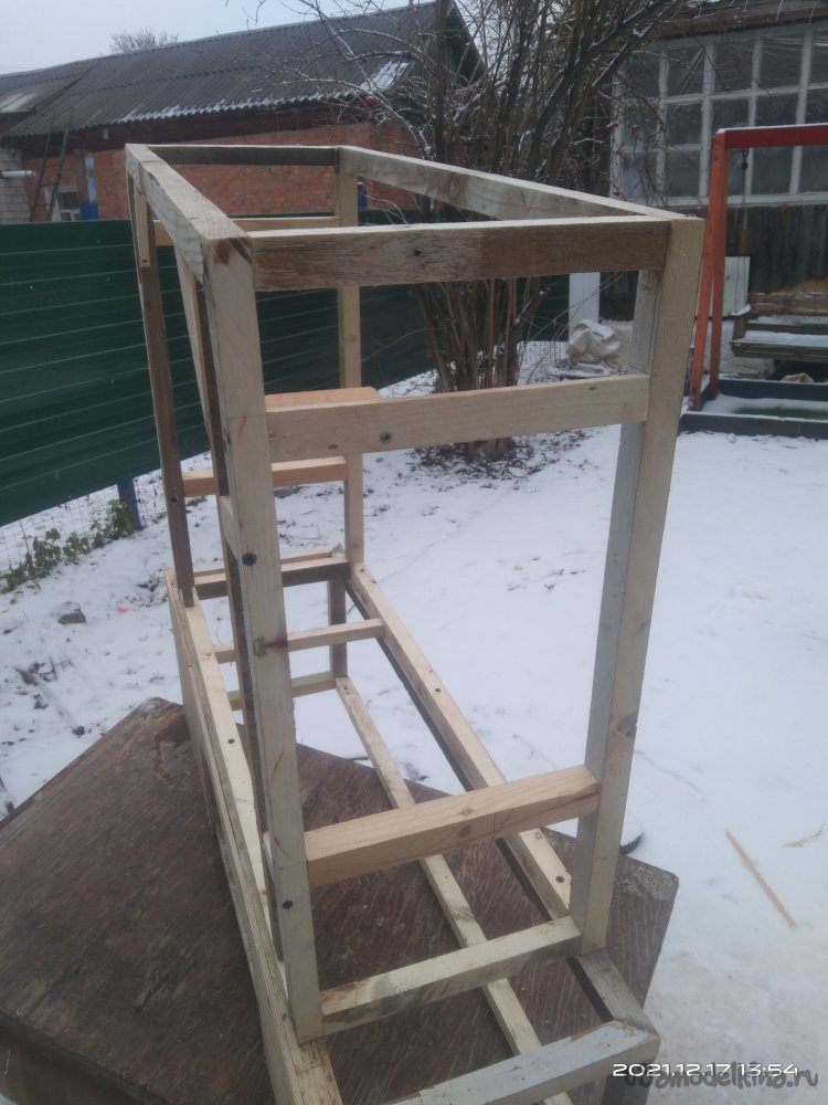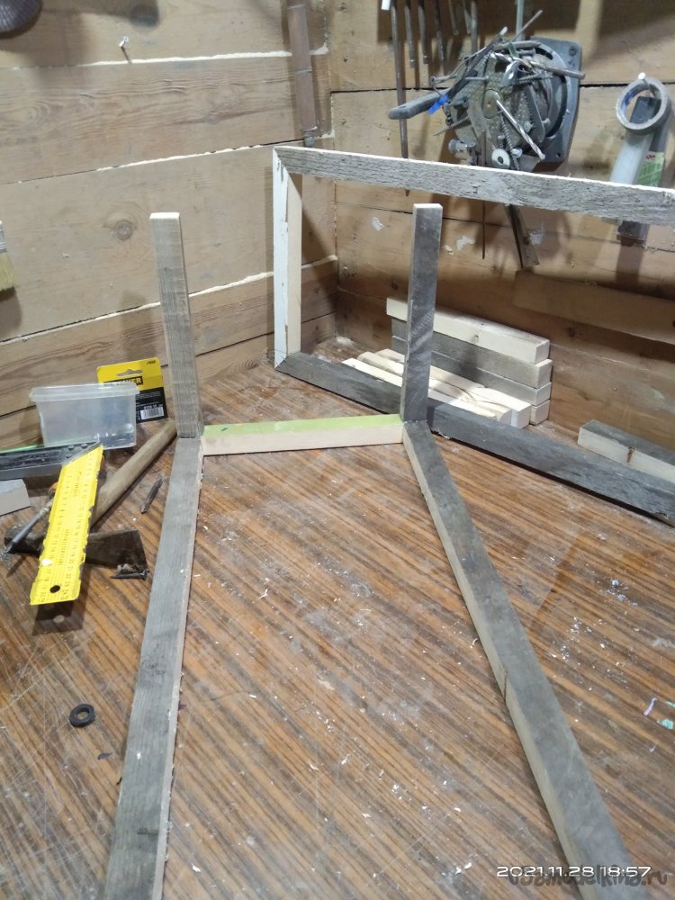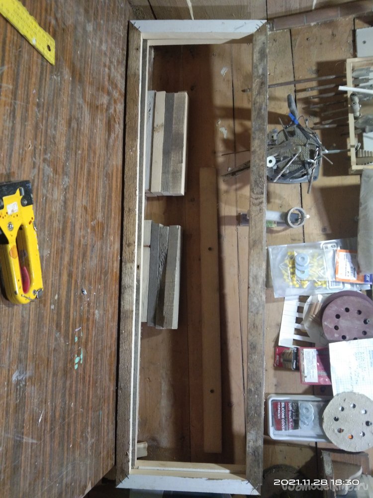 Итак, начнем. Для начала мне понадобились несколько досок, которые с помощью циркулярной пилы я распустил на бруски необходимой мне толщины. Это выходит дешевле по финансовым затратам, да и с размерами никогда не бывает проблем. Все использующиеся для этого материалы были не новыми, а остатки от других изделий. Полученные бруски были использованы для выпиливания заготовок основы камина. Мне нужно было собрать две детали, нижнюю, прямоугольной формы и верхнюю, практически квадратной. Торцевой пилой срезал углы под 45°. Нанес столярный клей на спилы и с помощью строительного степлера зафиксировал детали. Боковые крепежные бруски, а так же другие ребра жесткости закреплял так же клеем, но уже без скоб, а саморезами. Предварительно просверлив отверстия под них, чтобы избежать расщепления заготовок.