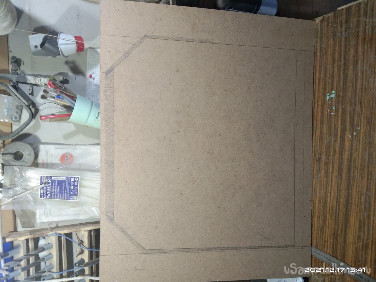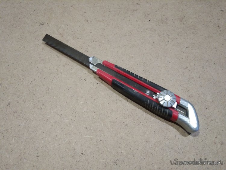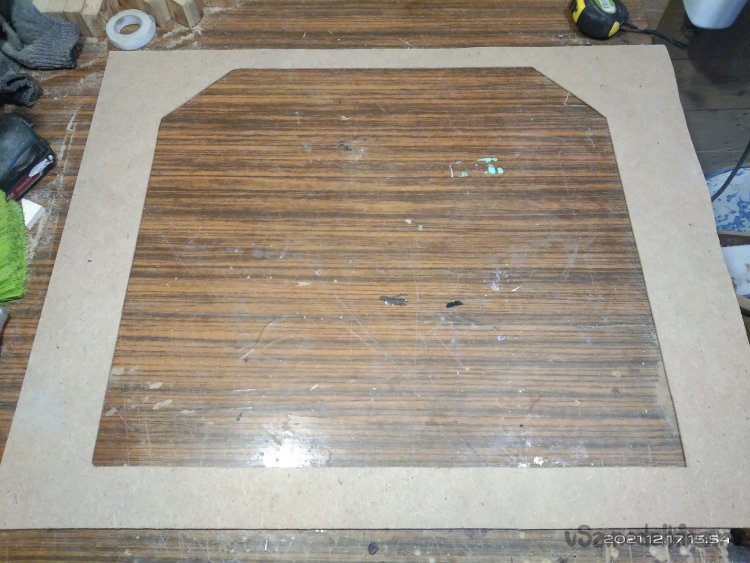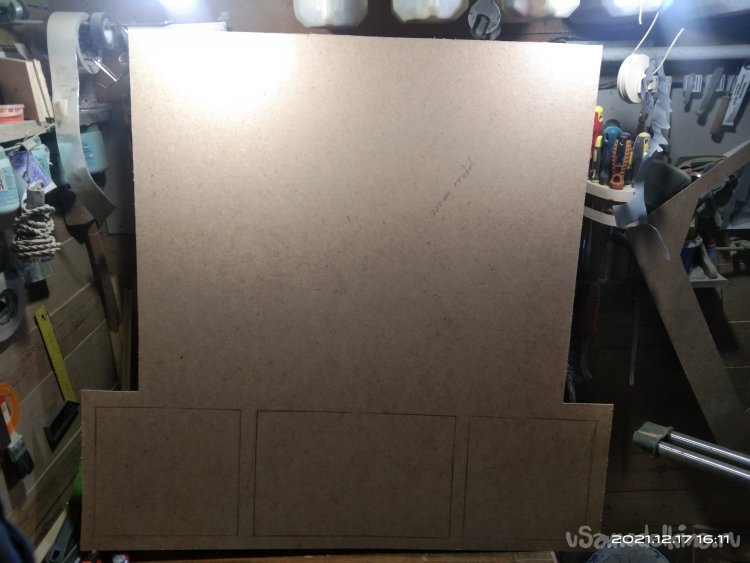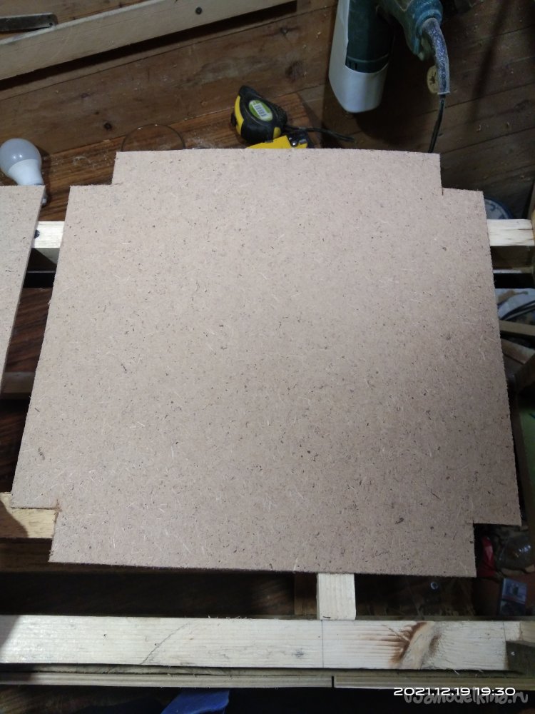 Далее начинаю полностью обшивать стенки камина и внутренние перегородки. Изначально планировал обшивать полностью фанерой, но впоследствии изменил решение в пользу ДВП. Так как оно намного легче фанеры, то, соответственно и вес готового изделия будет намного меньше, что в моем случае очень принципиально. Начал с лицевой стороны. На лист ДВП нанес разметку и по ней начал выпиливать. Для этого использовал небольшое приспособление, лайфхак как говорят сейчас. Взял половину сломанного полотна по металлу, рассверлил отверстие имеющееся на конце и вставил это полотно к канцелярский нож вместо лезвия. Получилась достаточно удобная вещь. Ею я до сих пор пользуюсь, но уже в большинстве случаев как пилкой, которая может отпилить мелкие детали в труднодоступных местах. С ее помощью все части обшивки и выпилил. Электролобзик не использовал, т.к. на тот момент не было нужного полотна. Закреплял обшивку и перегородки строительным степлером. Очень удобно и экономит массу времени. В отличие от фанеры, скоба с легкостью прошивает ДВП и в большинстве случаев не деформируется. Зазоры которые образовались заделал шпатлевкой по дереву, после высыхания которой зачистил наждачной шкуркой. Далее на всю внешнюю конструкцию нанес лак. Вырезал из ДСП крышку и закрепил ее саморезами.