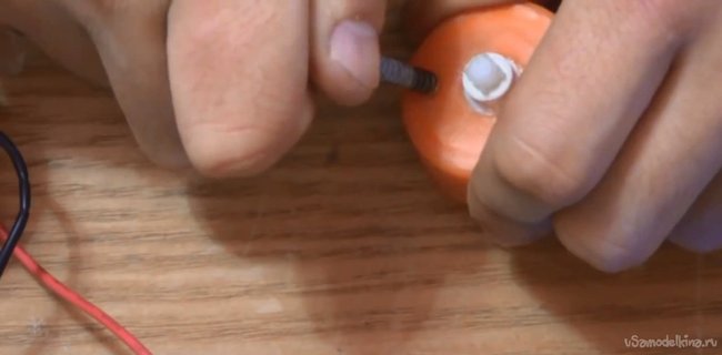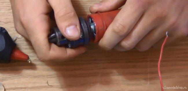 Когда патрон прикреплен к моторчику, его нужно поместить в баночку через нижнюю отрезанную часть так, чтобы провода выходили из верхней части. В процессе засовывания моторчика в баночку, нужно замазать его термоклеем для лучшей фиксации.