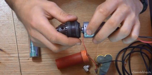 Материалы готовы, можно перейти к процессу изготовления мини дрели. Первым делом нам нужно прикрепить патрон к моторчику. Если моторчик взят от другого инструмента или прибора, то его необходимо обезжирить спиртом, и посадить на горячий клей. Если в таком случае конструкция будет неустойчивой и появится вибрация, то горячий клей следует заменить холодной сваркой, которая является минерало-полимерной композицией с двумя составами, смешивая которые получается что-то наподобие пластилина. Им нужно замазать отверстие на патроне, после чего прикрепить моторчик. Делать это необходимо быстро, потому что остывая холодная сварка становится прочной, как железо.
