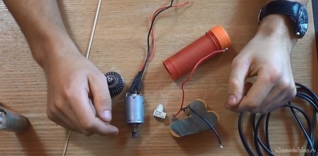 Итак, нам понадобится обычный провод, патрон, который можно приобрести примерно за 5-6 у.е., баночка от мыльных пузырей, донышко которой нужно отрезать и просверлить проход на крышке, а также моторчик, который будет крутить патрон и сверло.
