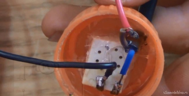 В крышке от баночки необходимо обеспечить полную изоляцию всех проводов, чего можно добиться обклеив все термоклеем.
