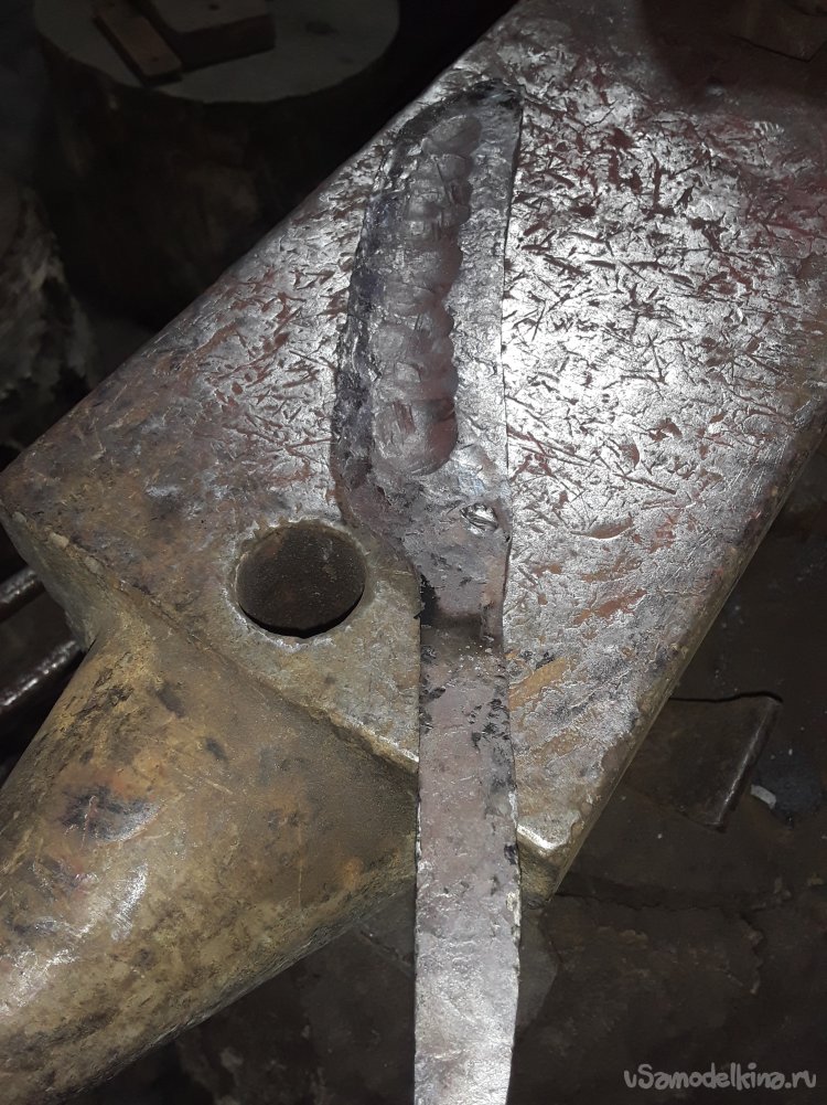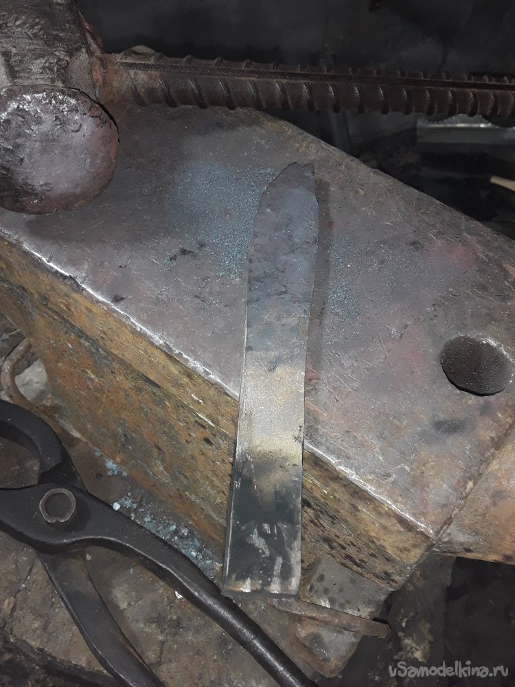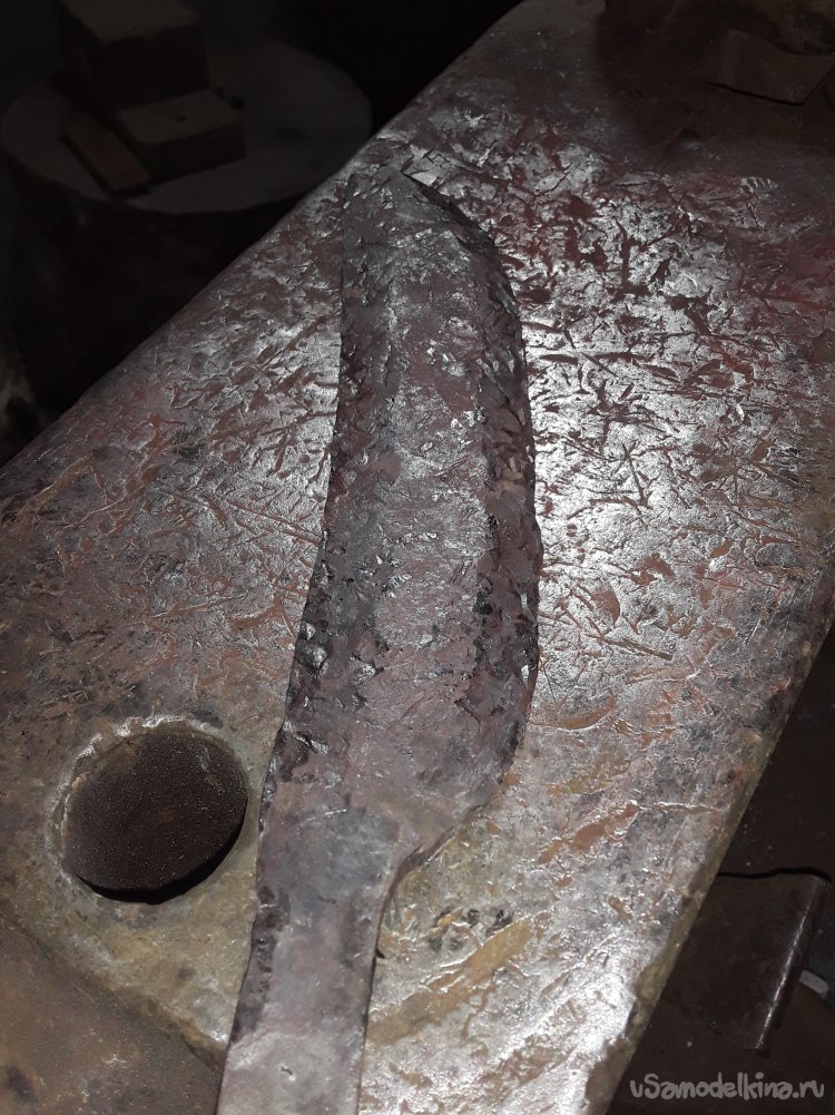 Особо рассказывать про ковку клинка нечего расскажу сокращенно. Нагреваю полосу и формирую острие, и толщину клинка далее отковал хвостовик. Для формировки дола использую шарик от шаровой автоваза от острия до хвостовика. После нескольких проходов дол от формирован теперь переворачиваю клинок долом в низ и формирую спуск немного отступив от края дола немного закругляя дол. Все отковано проверяю ровность и толщину клинка где что нужно поправлять. После всех работ металл стал мелкозернистым и хрупким для того чтобы снять напряжение металла его нужно нормализовать это нужно нагреть металл до закалочной температуры это где-то 900 гр и дать остыть на выключенном поддув горна. После остывания приступаю к слесарским работам.