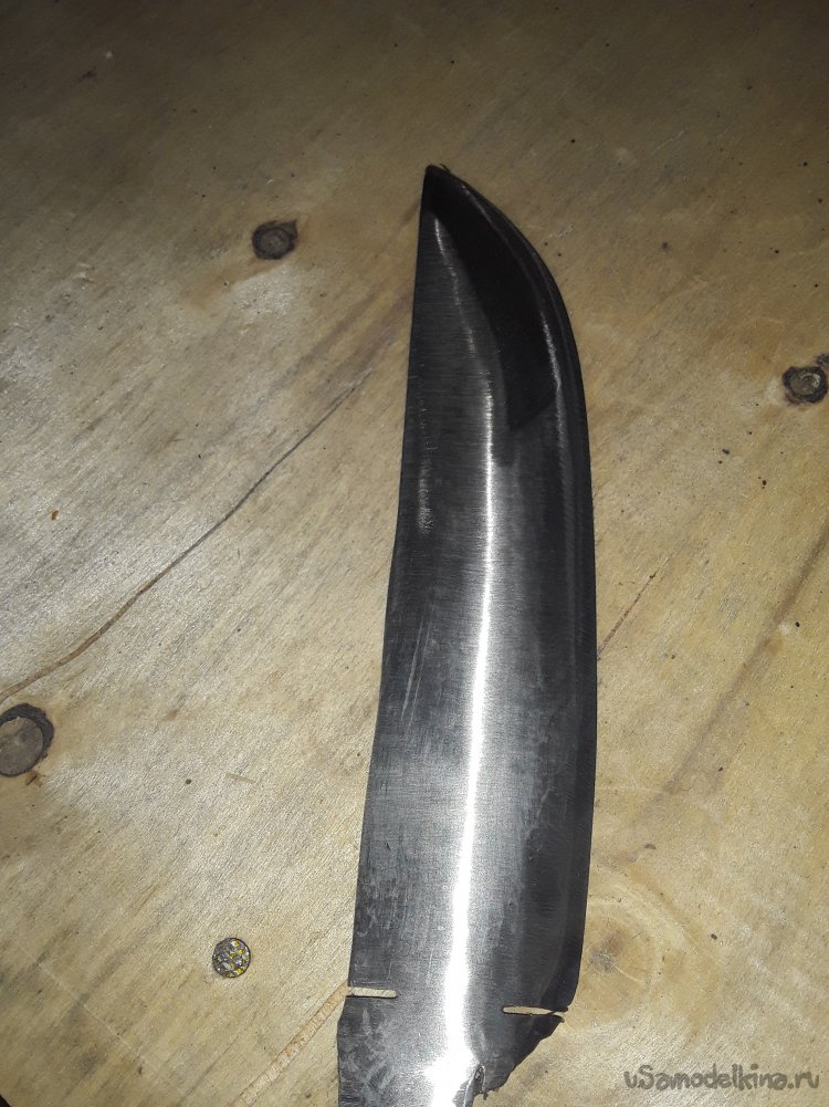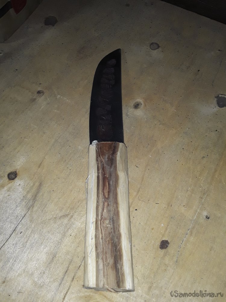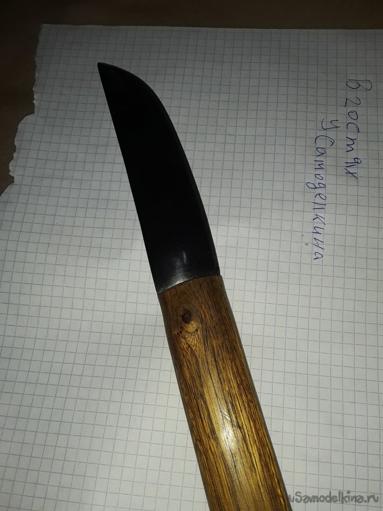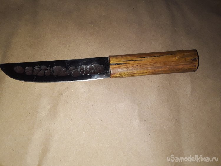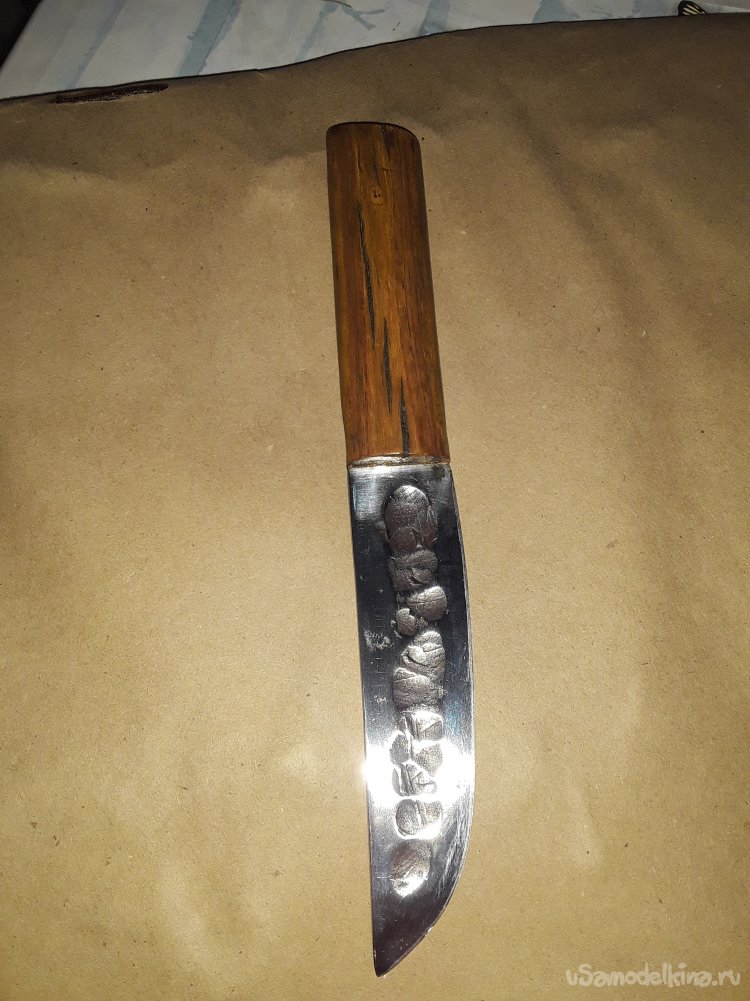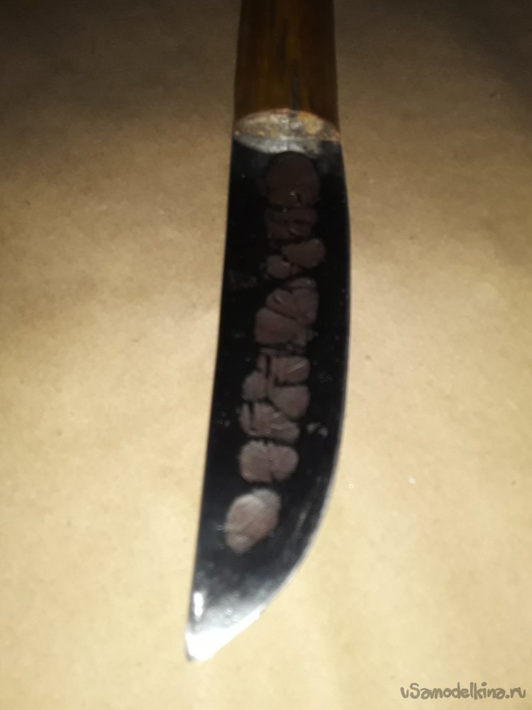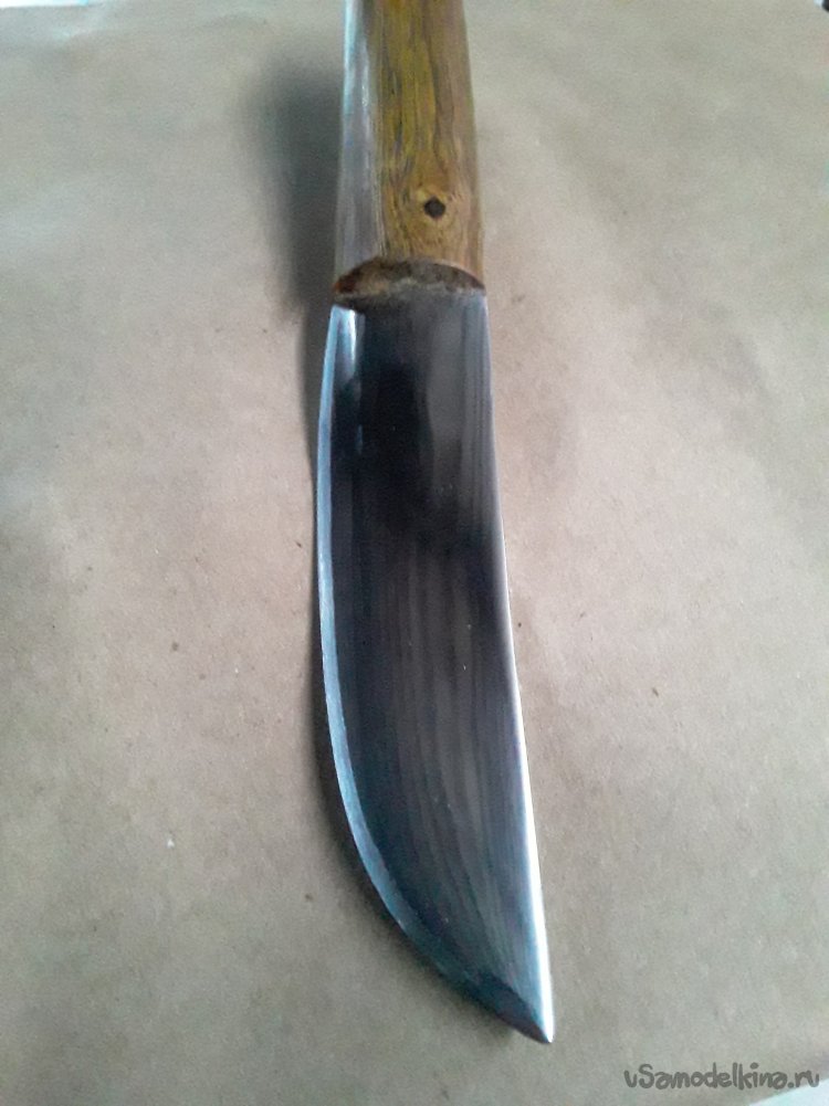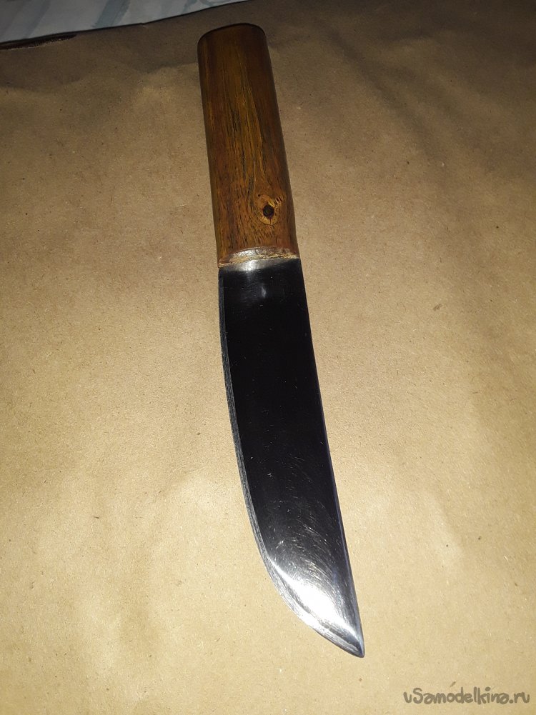 К сожалению когда варил рукоять в некоторых местах появились трещины их я залил клеем с опилками все вроде прочно, а трещины немного дают вида строго дерева клей все склеил прочно, а пропитка воском с канифолью даст не малую прочность дереву. Ну вот и все нож готов осталось подвести итоге статьи. Сталь клинка прочная не ржавеет хорошо, держит заточку. Рукоять пропитана воском с канифолью и не боится ни влаги ни грязи. Клинок откован с долом для правши так что хозяину клинка не нужно мучится с тем клинком что был испорчен. Ну вот и все моя статья подошлю к концу не судите строго делаю, как могу все мы начинали и делали не сразу совершенные клинки да и самоучкам не так уж и легко без совета знающего. С каждым последующим клинком мы станем опытнее так что всем кто что-то делает своими руками желаю огромного терпения и удачи в новых начинаниях. До новых самоделок друзья!!! Всем добра в ваш дом!!!