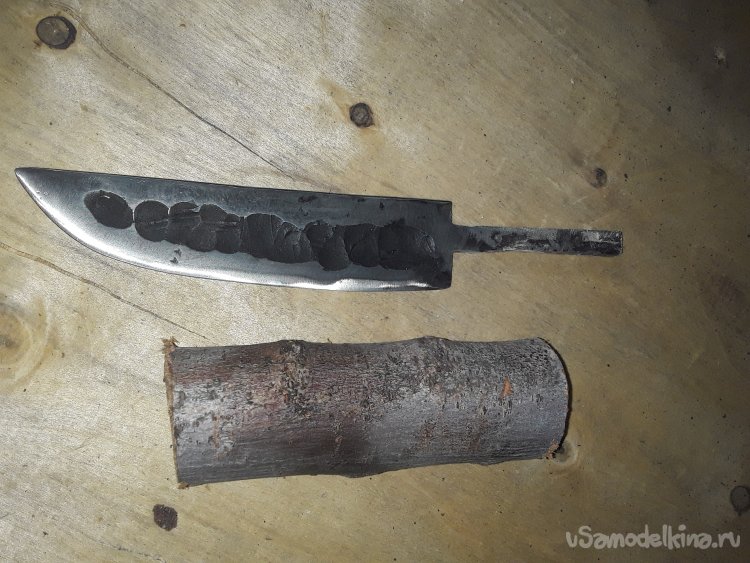 Для закалки клинка нагреваю клинок до желтого цвета это где-то 900-950 гр и окунаю в подогретое масло далее клинок идет сразу на отпуск. Температура отпуска в районе 300 гр в течение 2 часов. После отпуска клинок приобрел твердость в районе 50 ед. этого вполне хватит для якутского ножа. Теперь пара сделать рукоять традиционно для рукояти используют карельскую березу к сожалению у меня ее нет и по этому делаю из того что есть, а это сухой карагач он тоже крепкий и при должной обработки становится очень прочным и красивым. Поздно осенью на зиму я запас дерево для ножей у нас выбор не большей, а карагача море и бесплатно. Отмерив нужную длину отрезаю дерево, просверливаю отверстие в центре насаживаю клинок и залив все клеем забиваю щепу, для того чтобы скрыть отверстие и даю высохнуть сутки. После высыхания на грубой ленте убираю все лишнее дерево после придания формы прохожу все мелкой нож дачкой и приступаю к пропитке дерева для защиты от влаги.
