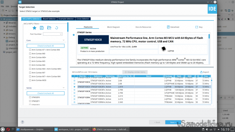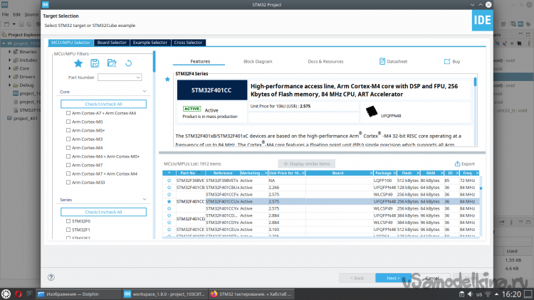 После установки вам нужно будет создать новый проект STM32, и выбрать ваш микроконтроллер: