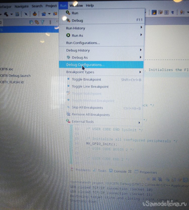Настройка STM32CubeIDE будет заключаться в том, что мы выберем имеющийся в наличии дебаггер в меню Run -> Debug Configurations...