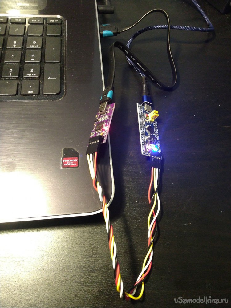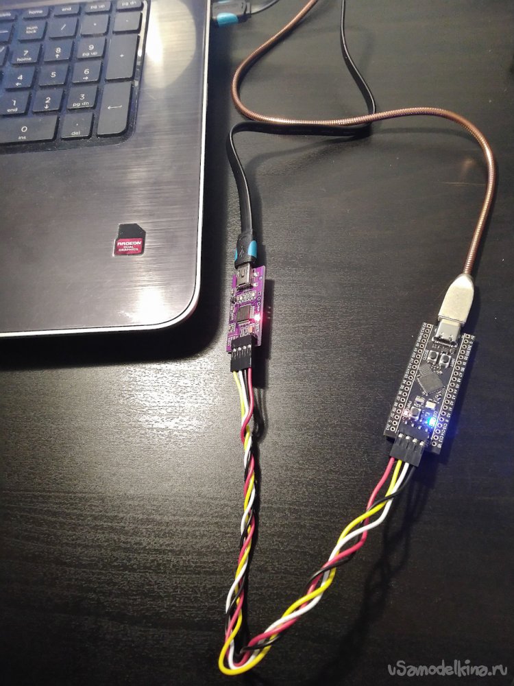 В USB-порт вставляется отладчик, а плата подключена к источнику питания.