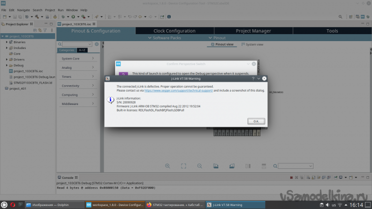 При первом подключении отладчика STM32CubeIDE предложит его обновить. Соглашаемся. Далее вылезет сообщение, предупреждающее, что мы используем дефектный (не оригинальный) отладчик, и действуем на свой страх и риск. Ваше право использовать оригинальный отладчик за кучу денег, если, конечно, они у вас есть.