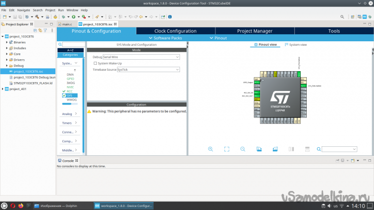 Далее В пункте System Core выбираем SYS и устанавливаем Debug через Serial Wire (SWD). Таким образом мы обеспечиваем работоспособность нашего отладчика.