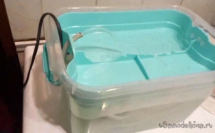 Добавляю в проект водяной насос, ведро и запускаю воду по кругу. Ничего так получилось, как настольный фонтанчик, водичка журчит, плещется.