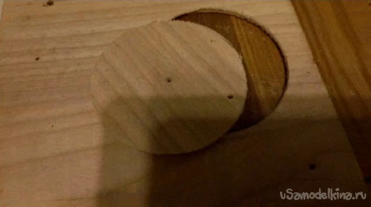 Не будем отвлекаться и займемся главным узлом проекта морозильной камерой. Для крепления компьютерного кулера понадобилась фанера размером 160х160х5. Отверстие для протока воздуха буквально выцарапал шурупом, закрепленным на приспособлении в виде циркуля. Это заняло пять минут, а за лобзиком пришлось бы ехать на дачу.