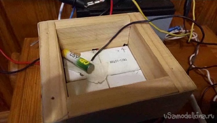 Термопасту нанес на элементы и приклеил их на приготовленное место. Получилась маленькая камера, в которой при подключении постоянного напряжения 12В, температура по всем ожиданиям должна понизиться ниже нуля.
