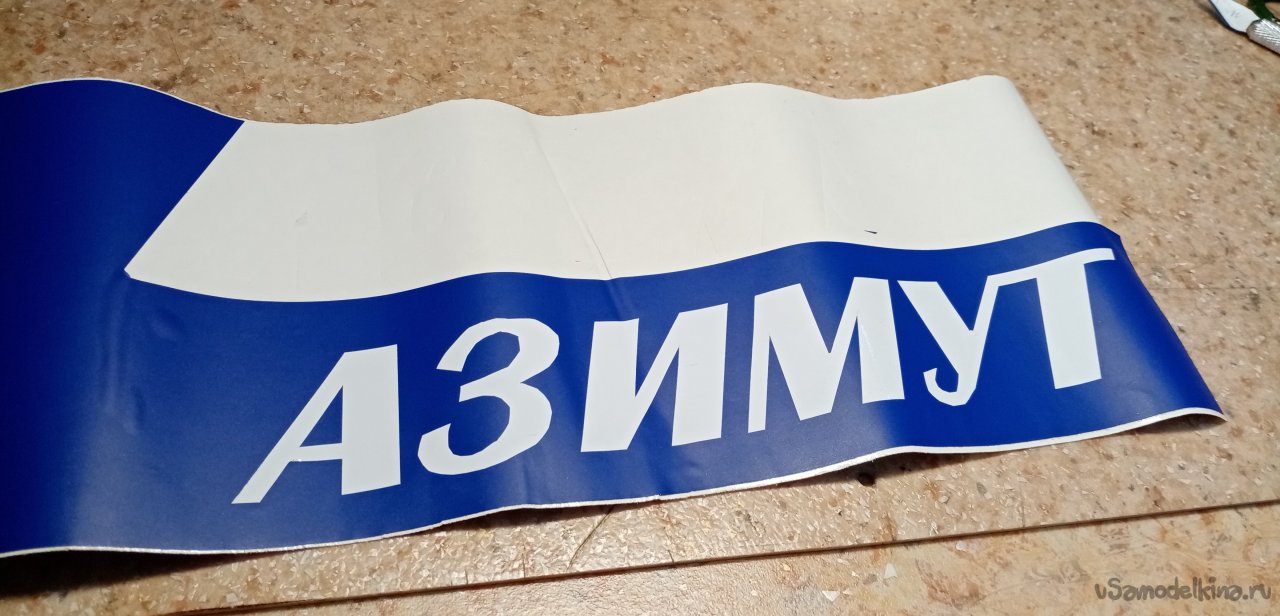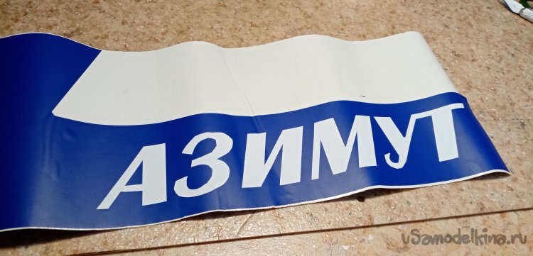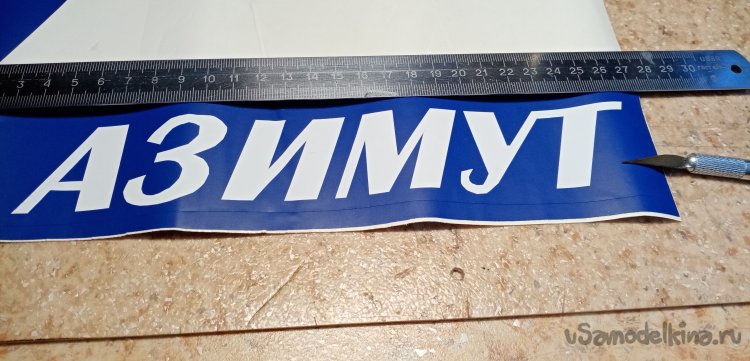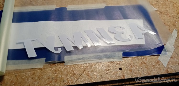Затем при помощи переносной пленки отделяю буквы от подложки и переношу на синюю рекламную пленку. Располагаю надпись в стороне от дефекта.