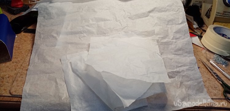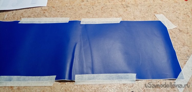Рекламная пленка попалась немного мятая, но другой нет к сожалению. Расправляю и закрепляю на столе малярным скотчем.