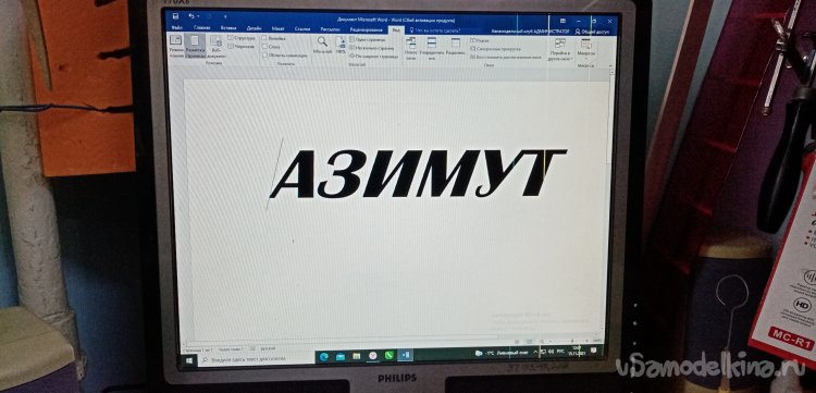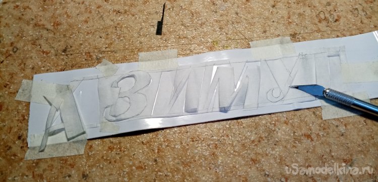 Закрепляю кальку на экране при помощи малярного скотча и переношу на нее надпись карандашом. Можно конечно вывести на принтер, но я как слон рисую карандашом. По задумке буквы изображу блестящим скотчем и обводкой по контуру рекламной пленок цвета ультрамарин.