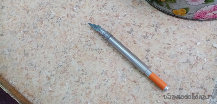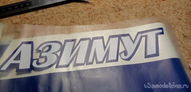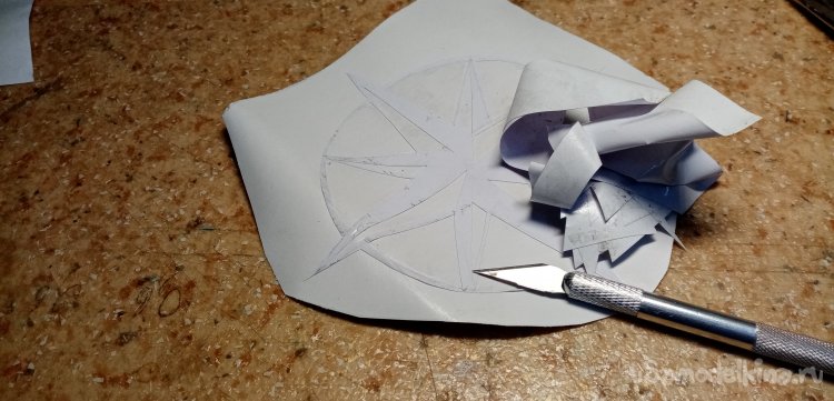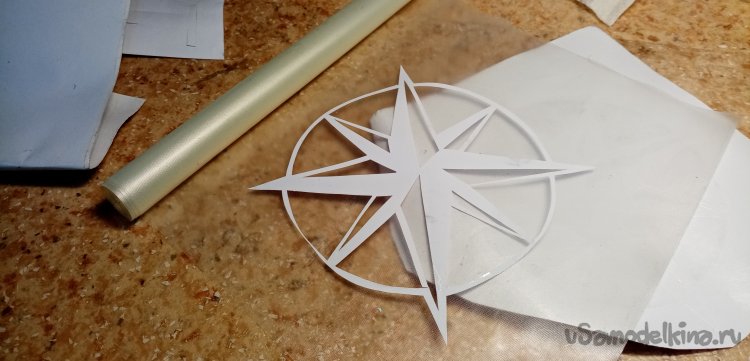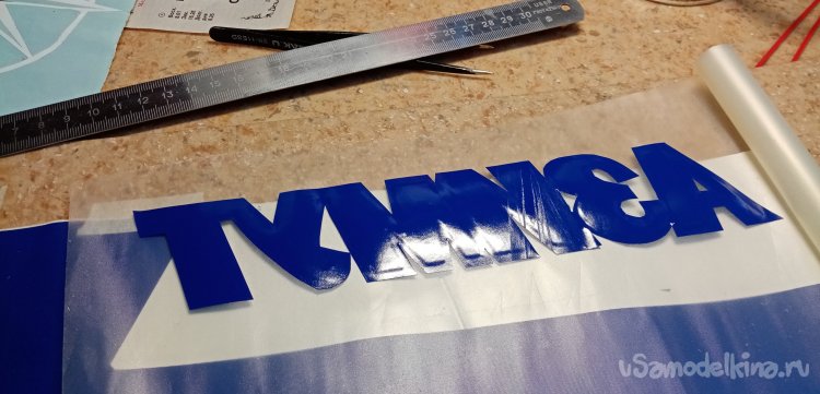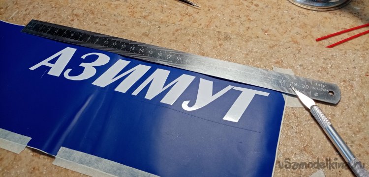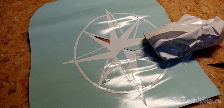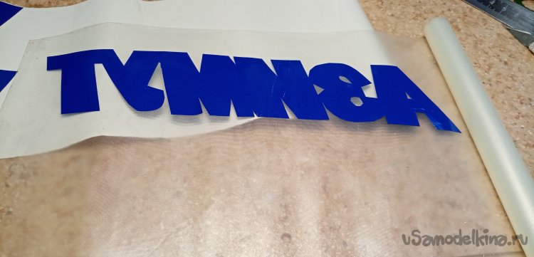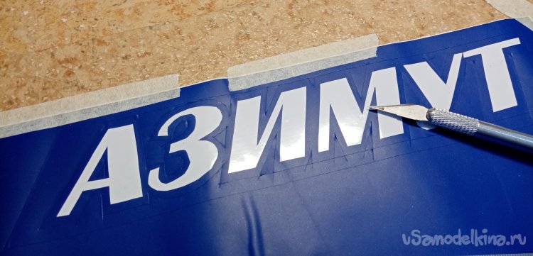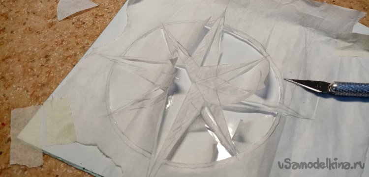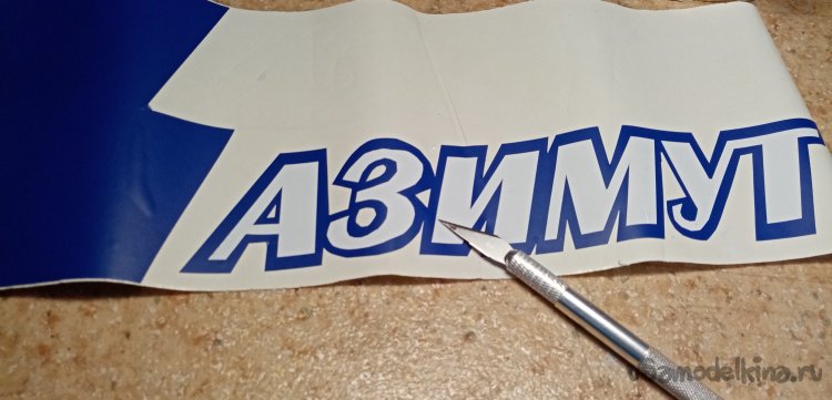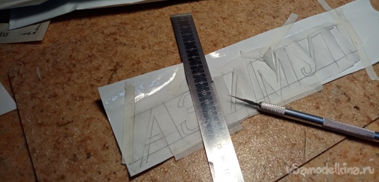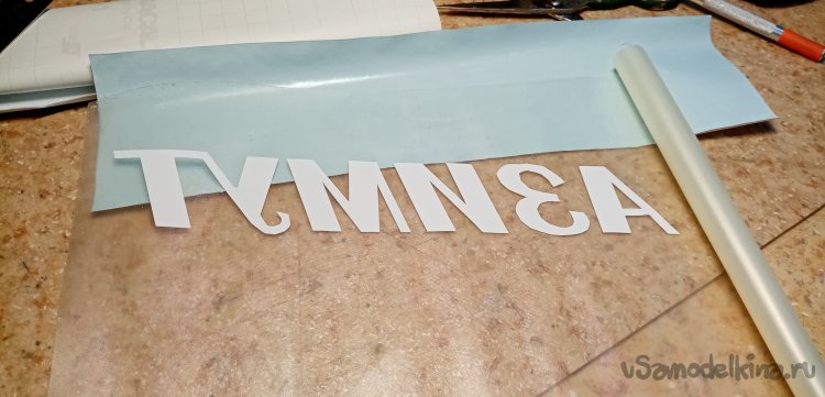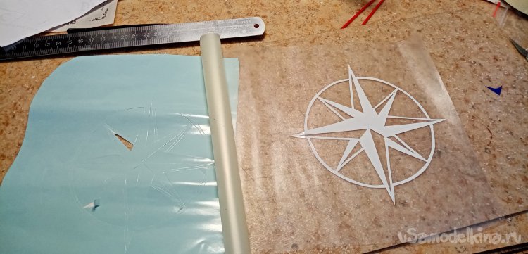 Кальку наклеиваю на рекламную пленку, вырезаю по линейке все прямые линии изображения, кривые просто от руки. Удаляю фон. Картинка готова к переносу на модель.