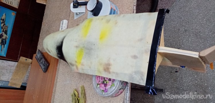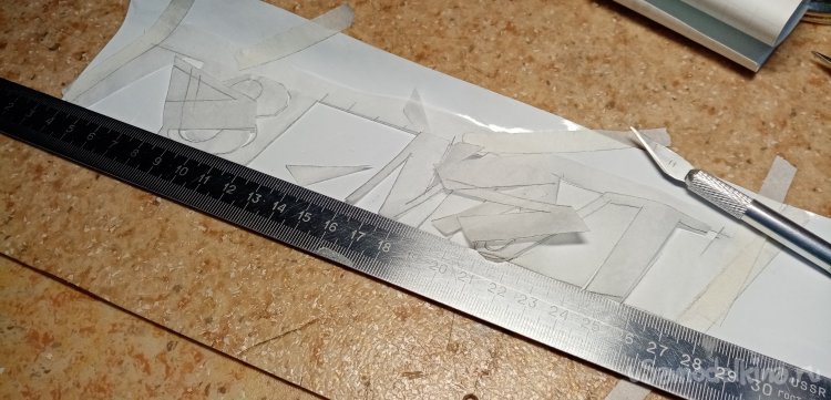 Остался пилон двигателя с замысловатой поверхностью сложной формы. Работал по проверенной схеме, где можно клеил скотч широкими полосами, в трудных местах узкими.