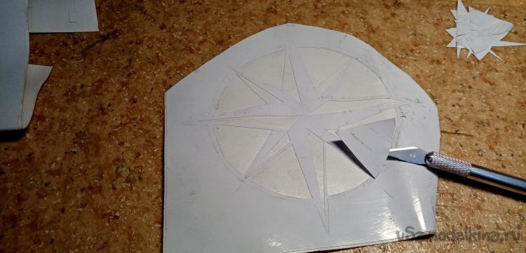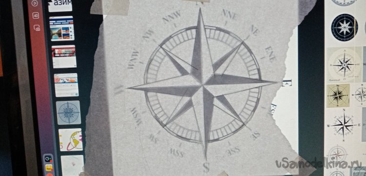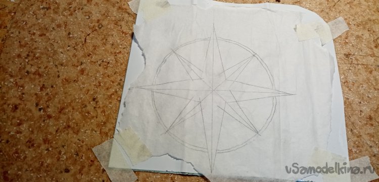 Перехожу к эмблеме. Нашел в интернете картушку компаса, подходит к названию. Только изображение мелкими деталями перегружено. При перерисовке немного упростил. Технология все такая-же. Вывожу в нужно масштабе на экран, закрепляю кальку и карандашом рисую.