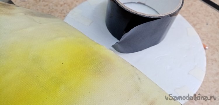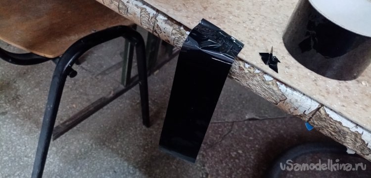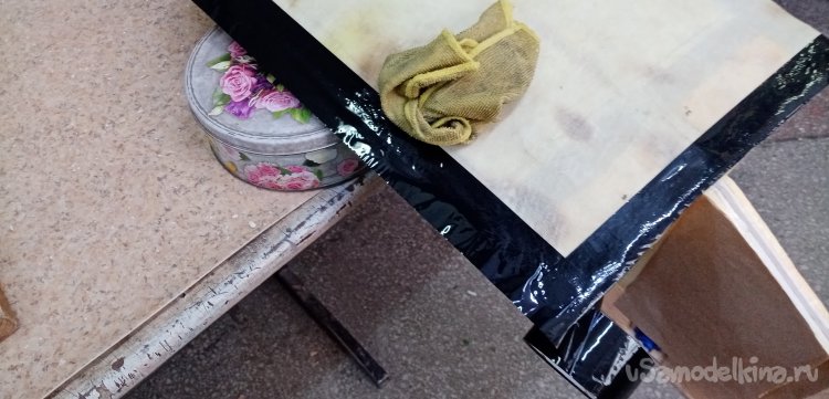 Начинаю с днища. Протираю всю плоскость влажной тряпочкой, удаляя пыль. Первая полоса поперек со свесами. Края скотча загибаю через край конструкции, для надежности приклейки.