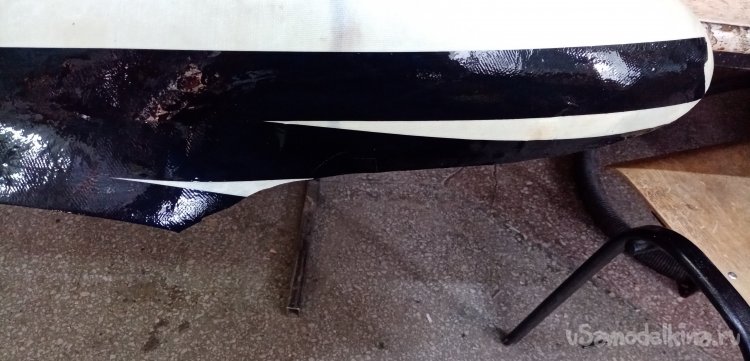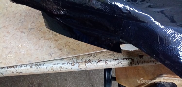 Затем начинаю приклеивать продольные полосы со свесом. Края загибаю внутрь. С некоторым наложением, дополнительный замок. К стеклопластику скотч клеится не сильно, но сам к себе отлично. Собственно он для этого и сделан. В некоторых местах значительного перегиба поверхности разрезаю край скотча на полосы при помощи лезвия и загибаю.