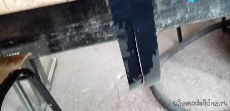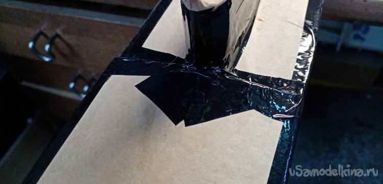 Её заклеиваю полосами до перегиба, образовавшиеся прорехи зарываю полосками скотча.