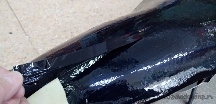Чем больше кривизна поверхности, тем уже полоски. Узкие немного тянутся и изгибаются, можно хорошо наклеить на криволинейную поверхность. Приглаживаю скотч к пластику влажной тряпочкой.