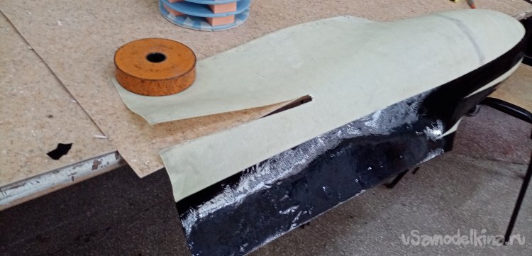 Тяну продольные полосы по прямой до крайности. Образуются прорехи в обшивке, их заклеиваю дополнительными полосками.