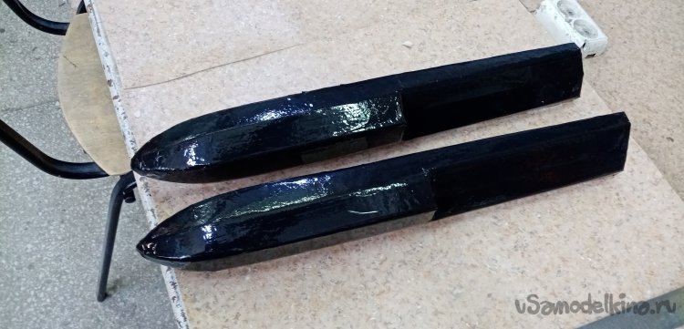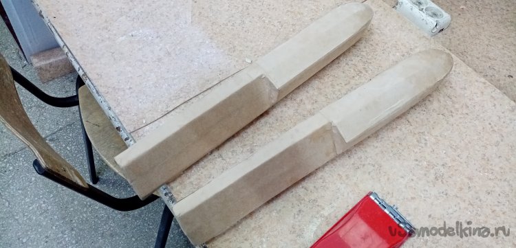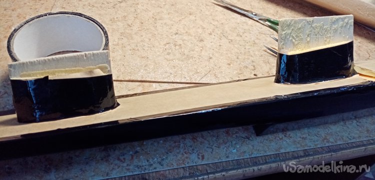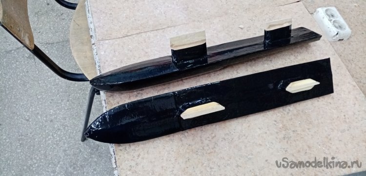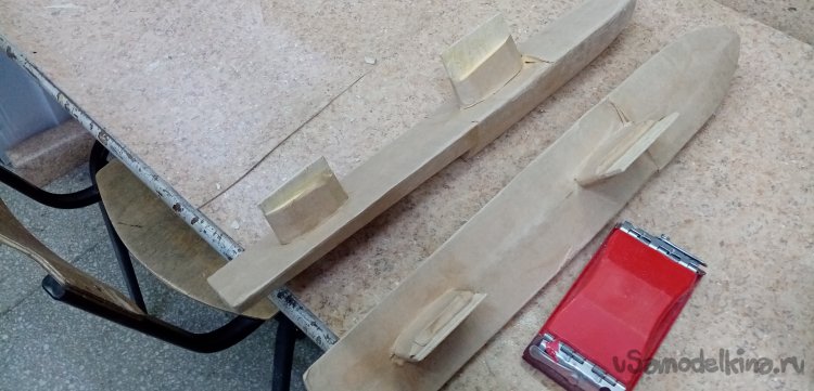 Остались на сладкое шасси в виде поплавков. Тоже замысловатой формы с реданами на днище и вертикальными стойками. Опять-же оклеены бумагой. Грунтую поверхность разбавленным титаном. В некоторых местах пришлось пройтись шкуркой. Протираю поверхность влажной тряпочкой убирая пыль. Можно начинать клеить скотч.