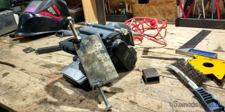 Вырезаем прямоугольник из листа металла размером под верх вашей машинки. Это будет площадка для приваривания на нее гаек М8. Болты М8 будут вкручиваться через эти гайки в отверстия на корпусе машинки и таким образом удерживают ее очень надежно. В моем случае потребовалось немного рассверлить эти отверстия, т.к. болт М8 с натяжкой заходил во внутрь.