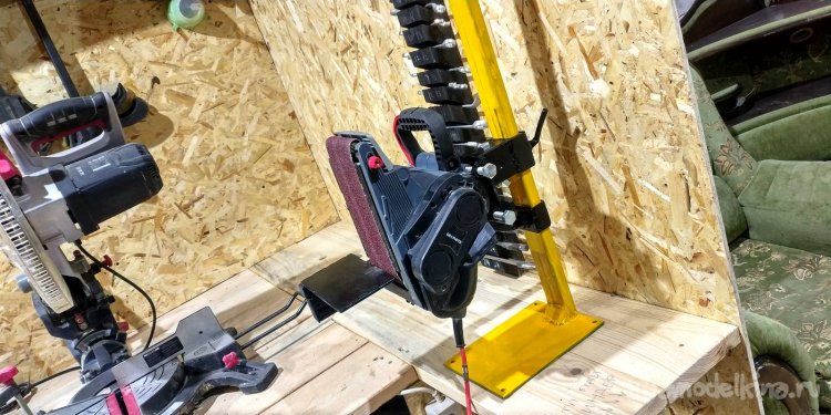 Как видно из фото - я еще не закрепил тогда стойку. И сейчас я ее тоже не закрепил, оказалось, что для разных видов заготовок стационарное расположение мини-гриндера не подходит. Поэтому я подставил половинку обувного поддона под стружки и поворачиваю стойку на 45-90 градусов в обе стороны. Хотя отверстия для крепления заранее сделал))