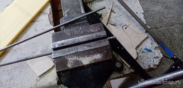 Нужно приготовить элементы подвески «рожки». Эти детали буду делать из алюминиевой трубки диаметром в шасть миллиметров. Зажимаю в тиски и отрезаю в размер ручной ножовкой по металлу.