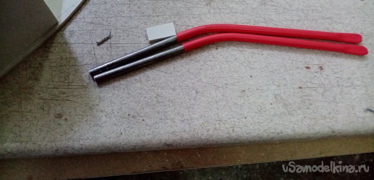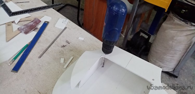 Подбираю сверло диаметров 5.9мм, достаточно длинное, чтобы посверлить столик насквозь. Освобождаю от грузов изделие и разметив места установки «рогов» засверливаюсь.