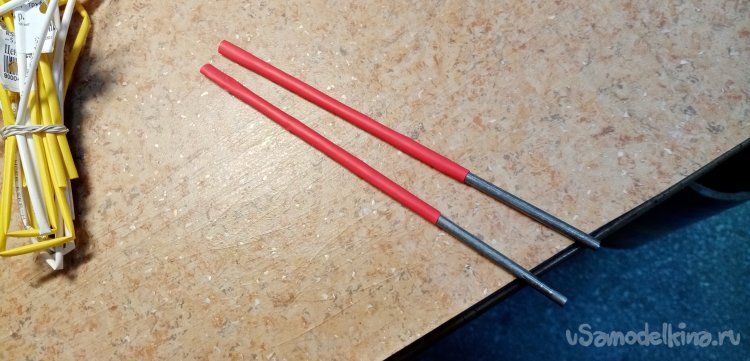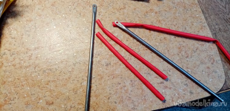 Есть два варианта декорирования трубок. Отполировать и натянуть термоусадку. Выбираю второй. Красная трубочка диаметров 6 мм. Одеваю и осаждаю термофеном при температуре в 200°C.