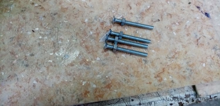 Они совершенно плотно вкручиваются во внутренний диаметр, плотно, даже резьбу нарезать не нужно. Но длинноваты. Накручиваю на болтики гайки, зажимаю в тиски и ручной ножовкой по металлу отпиливаю в нужный размер. Затем на электроточиле зачищаю края реза и скручиваю гайку. она окончательно поправляет резьбы на краю болтика.