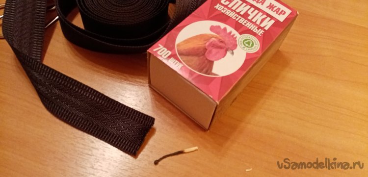 Разрезаю ремень на заготовки, материал сплошная синтетика, сыпется. Сразу заплавляю края спичками.