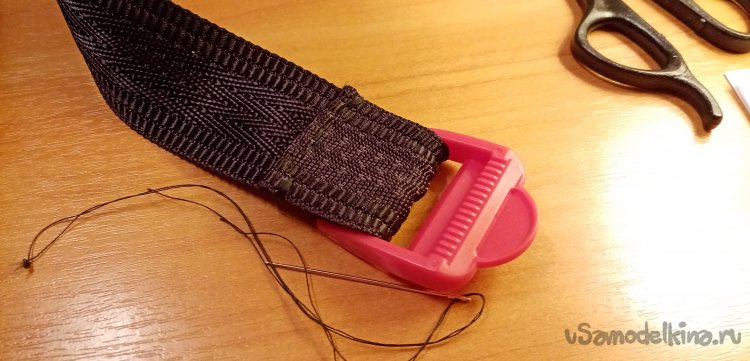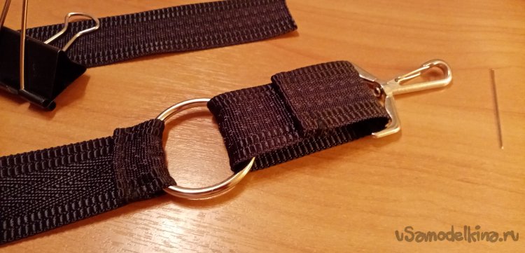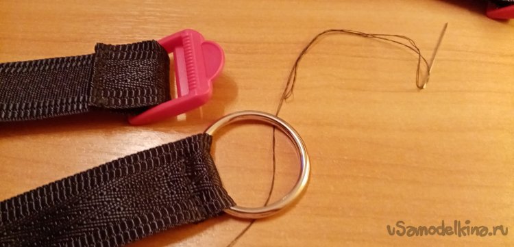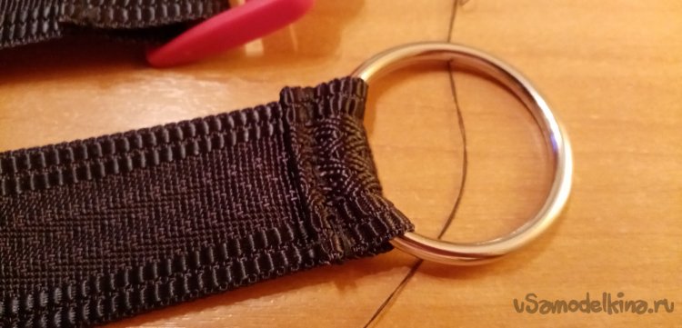 Прижав для удобства конец ремня пришиваю его в кольцу.