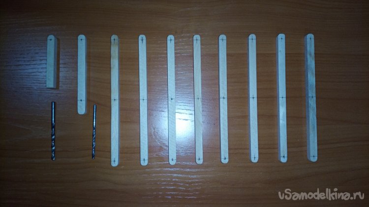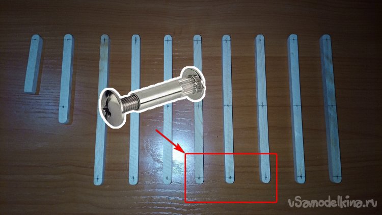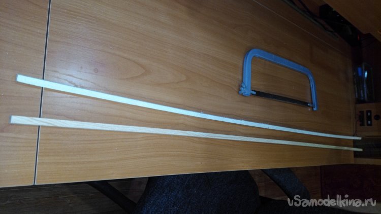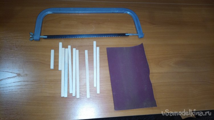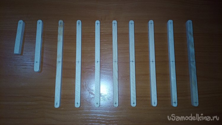 В общем взял я этот штапик. Разметил на 8 равных частей и две поменьше. Затем распилил ножовкой по металлу. Спросите почему? Штапик из сосны и если его пилить обычной ножовкой по дереву, то спил получится очень грубый, а у ножовки по металлу зубцы маленькие и ей вполне можно аккуратно отпилить без сколов.