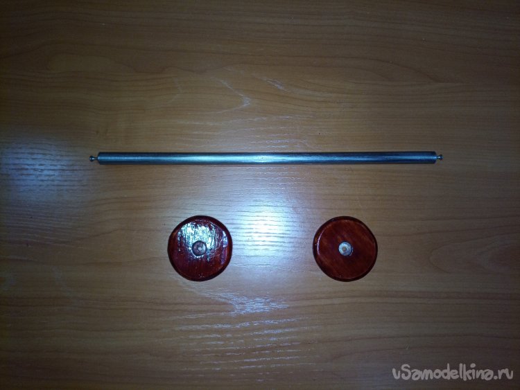 Вот детали стойки уже в готовом виде. Она будет стоять в распорку в проёме шкафчика. Трубку отпилил размером чуть меньше чем проём. Внутрь забил чёпики к ним будут прикручиваться пятаки распорки двумя саморезами.