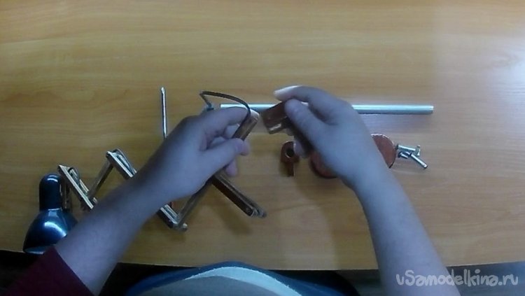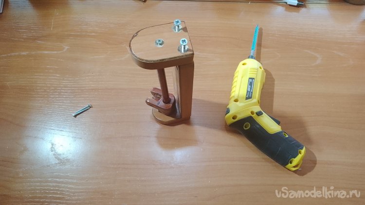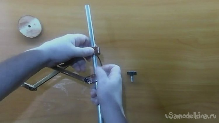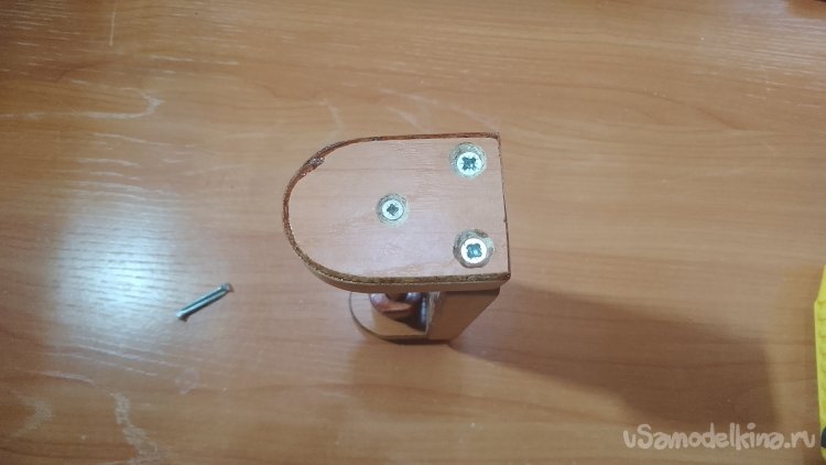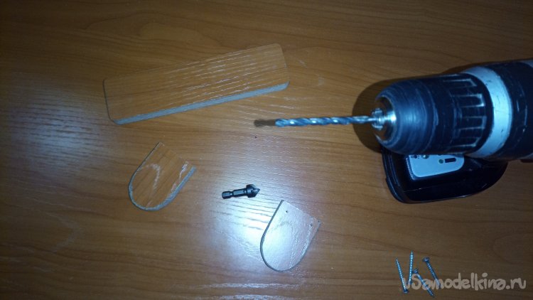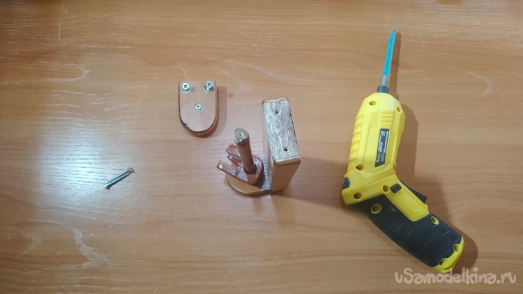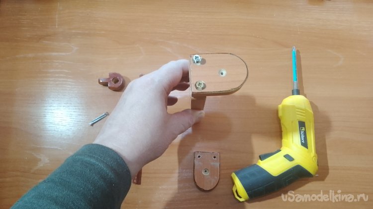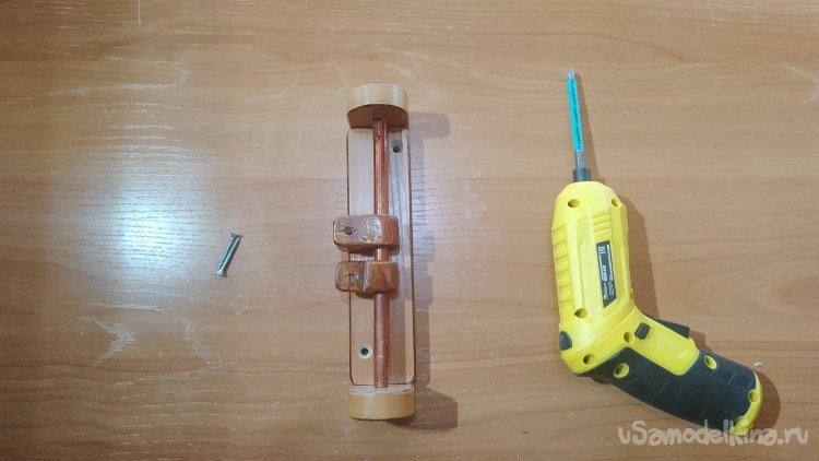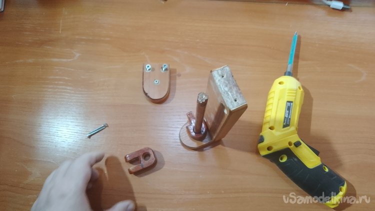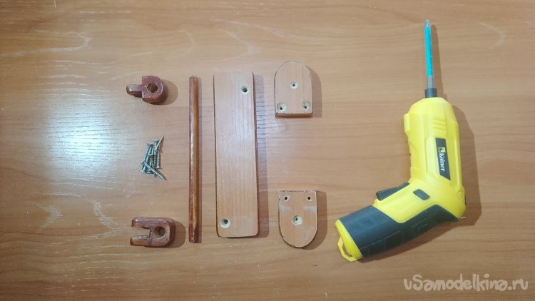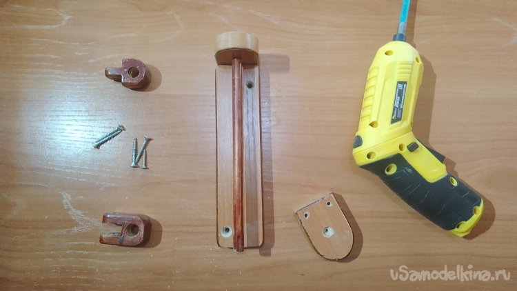 Далее разметил и просверлил отверстия под шурупы и под направляющую штангу, которую сделал из дерева - диаметром 8 миллиметров.