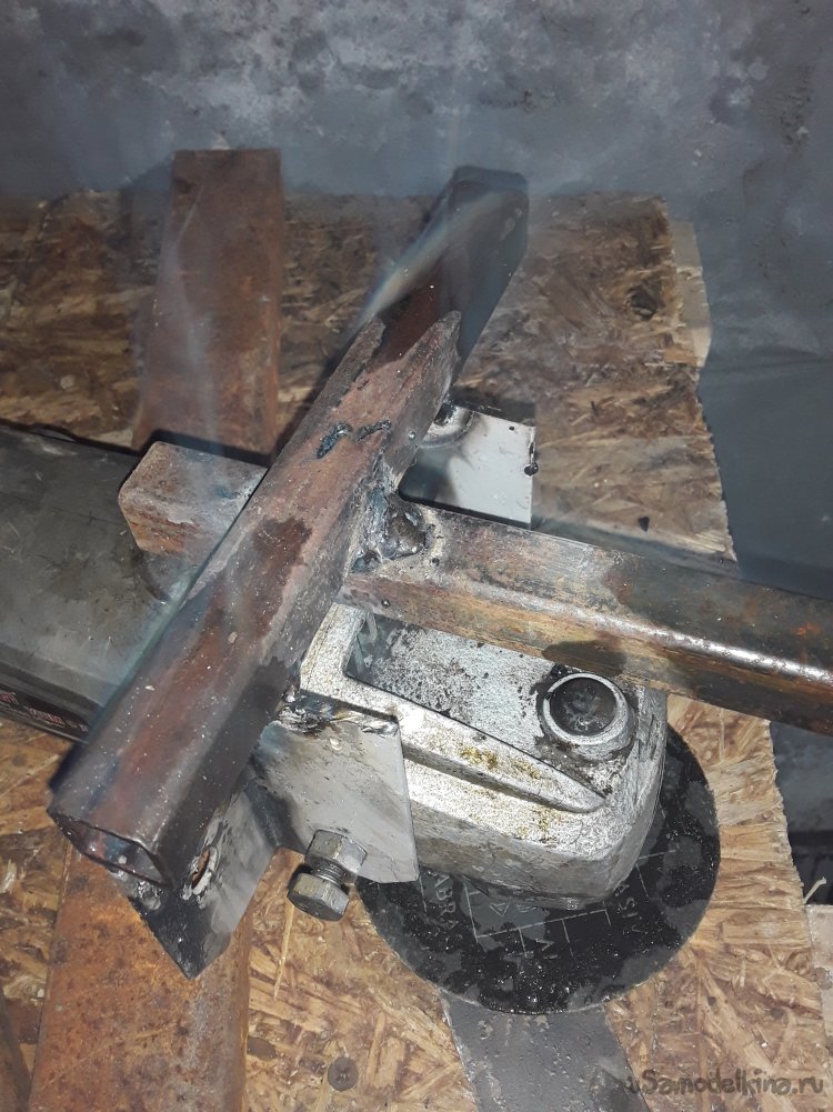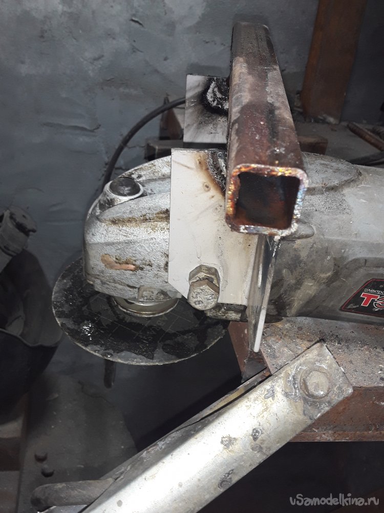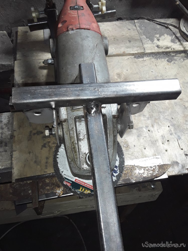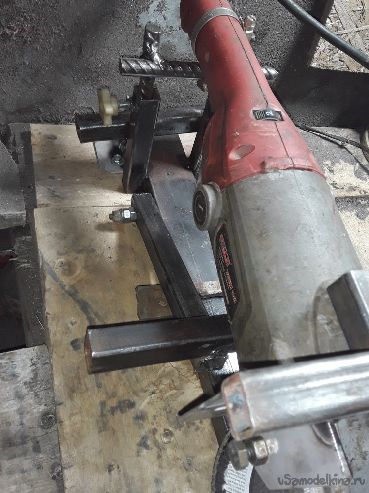 Для крепления рукояти в корпусе болгарки есть два отверстия с резьбой отмерев примерную высоту от отверстия до конца корпуса отрезаю 2 куска уголка так, чтобы от высоты корпуса еще было 20мм и закручиваю на болты с контра гайкой затем выставляю все ровно и сверху прям на уголки привариваю квадрат 20на20мм так как я оставил 20мм просовываю отрезок квадрата так, чтобы он ровно уперся в корпус болгарки так рукоять не только для удержания болгарки, но и она не дает ей шевелится и прочно держит на своем месте. Длину ручки я взял 30см а так кому как удобно там особо роли длина не имеет. На первой штуки у меня эта ручка была по всей длине болгарки, а в конце через болт крепилась к станине которая регулировала угол шлифовки. Здесь же я хочу немного сделать по другому. Вот и все основное устройство сделано теперь приступаю к скелету.