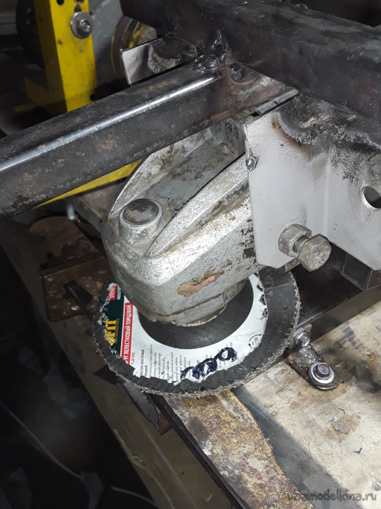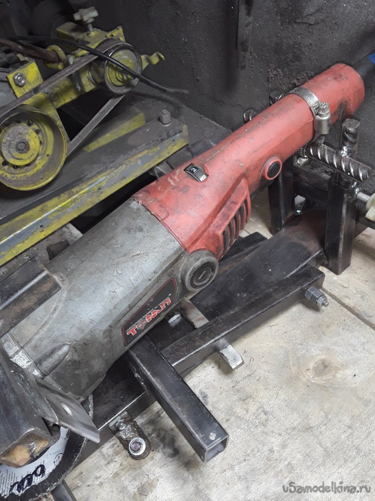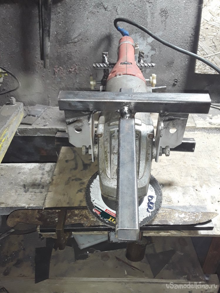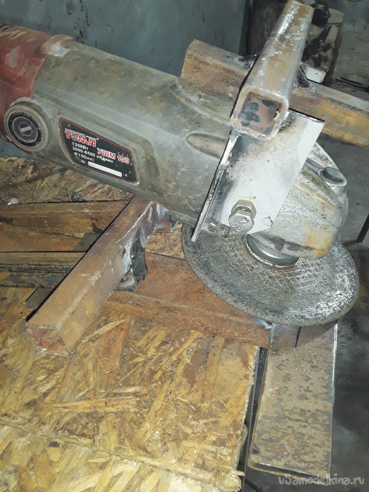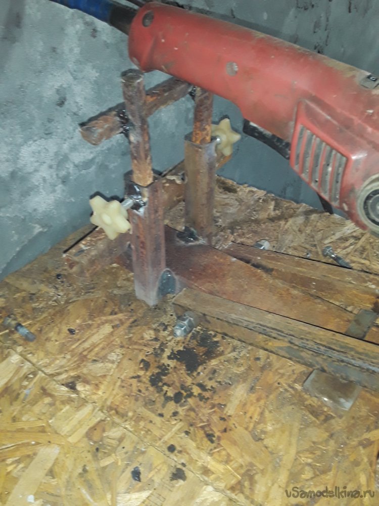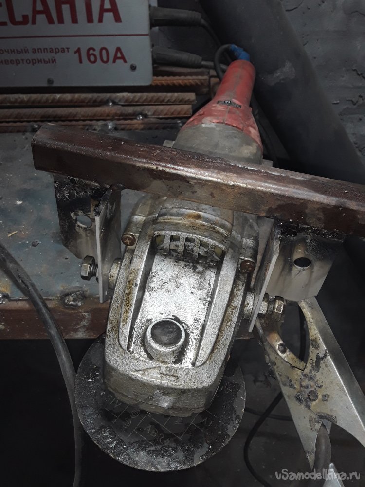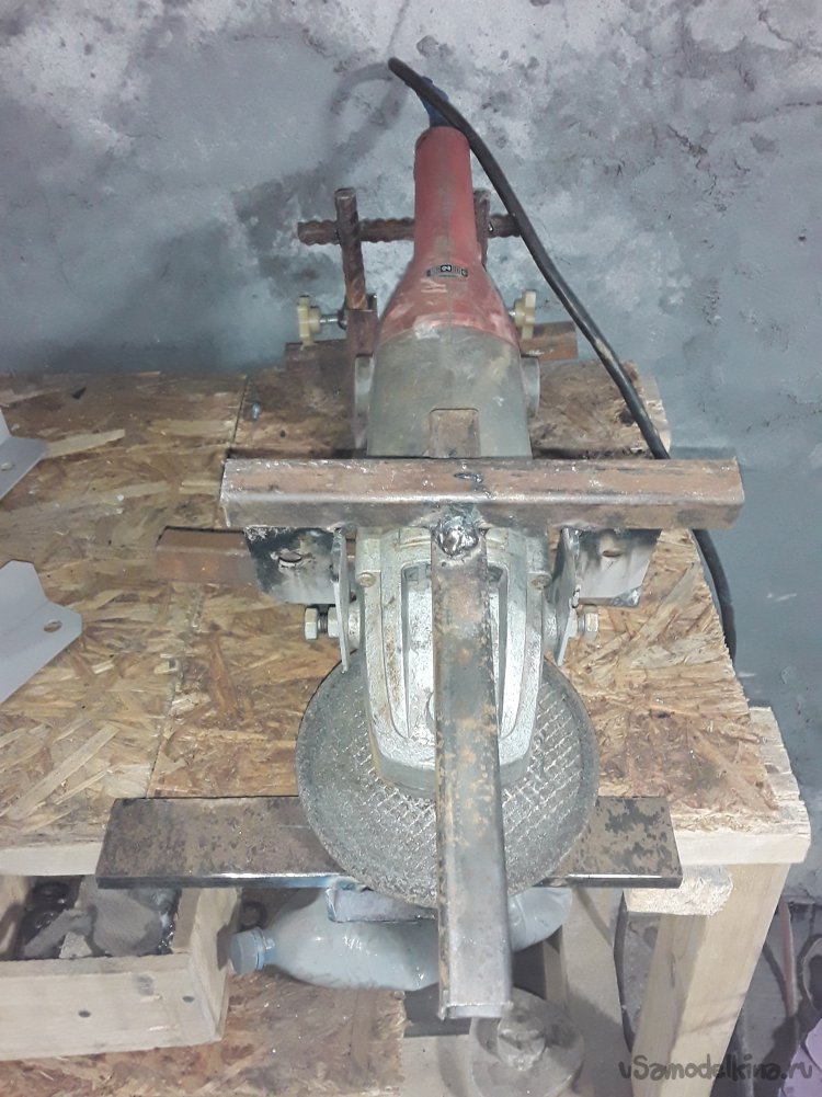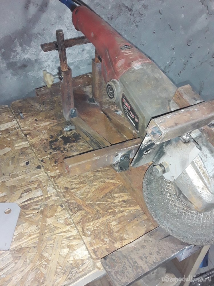Вот и все разбираю и зачищаю до блеска сческой на дрели красит решить не буду это приспособление не для постоянной работы да и рабочий инструмент всегда должен ухоливаться поработал, протер тряпочкой потом как придет тепло разберу и покрашу. После зачистки все собираю на свои места и будем проверять. Для того чтобы зафиксировать к основной станине болгарку ничего лучше не придумал как просто одеть на болгарку хомут 35мм а через него на стойку хомут чуть меньше 20мм и все затянуть это решение самое простое и временное тем более этот вариант держит даже вполне хорошо хотя то что временно все на постоянно.