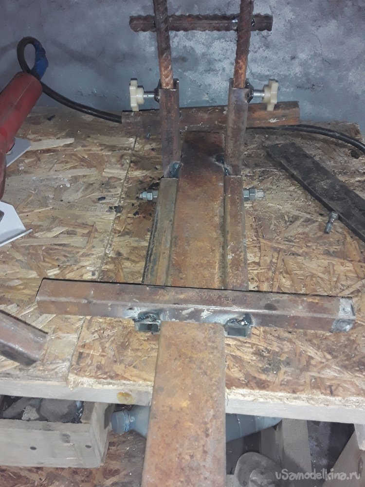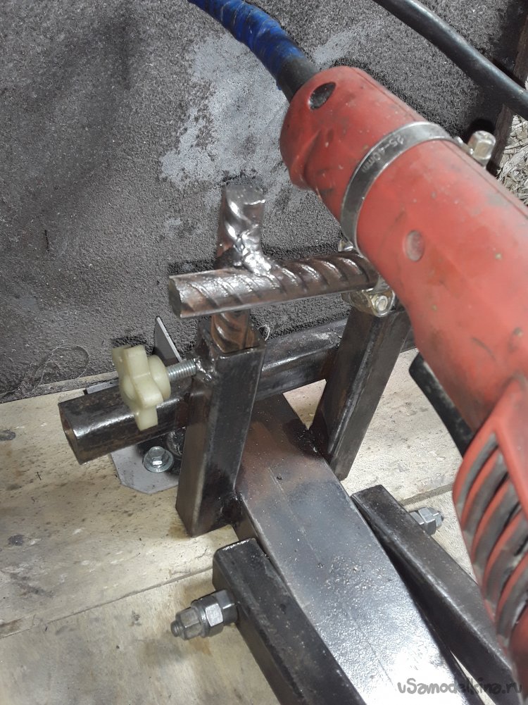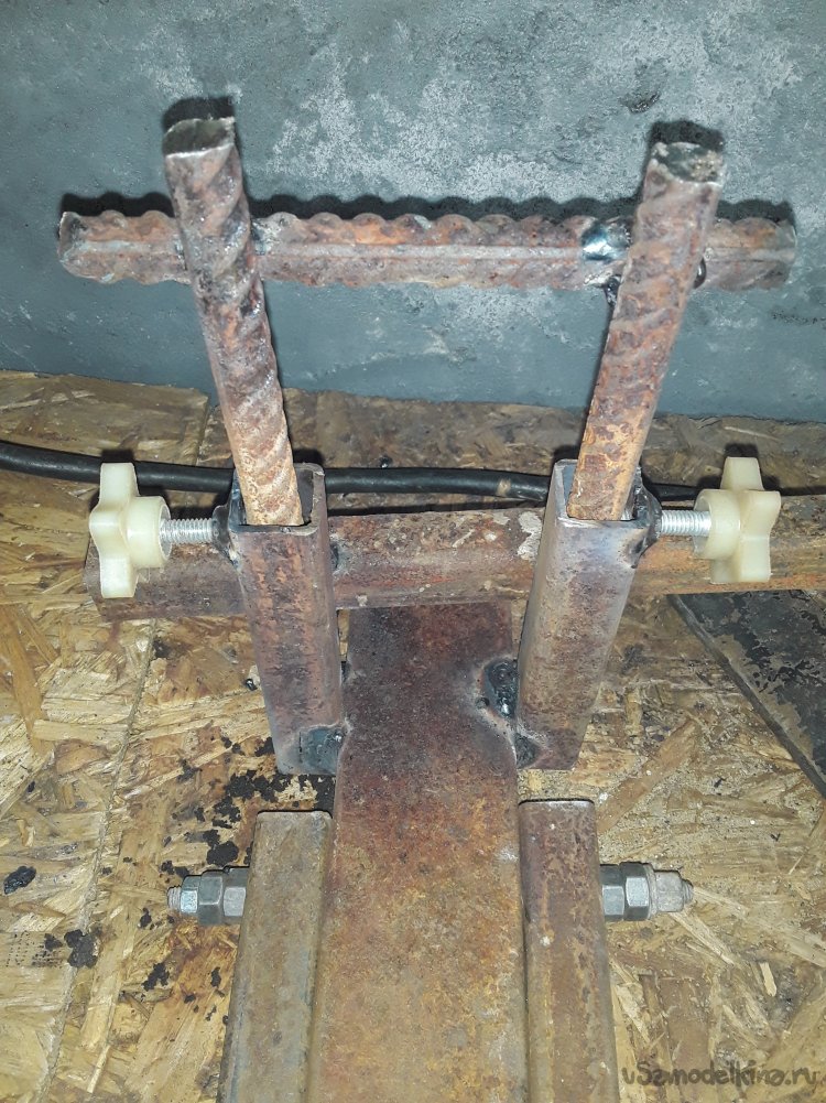Для основного упора который будет давать нужный угол шлифовки я привариваю 2шт 10см длинной квадрата на основания не забыв просверлить отверстия и для барашка и приварив туда по 1‐й гайке. Для надежного удержания к квадрату приварил растяжку на всякий случай. Для стойки отрезал 2шт куска по 10см арматуры 16мм можно любой кругляк, но и арматура тоже пойдет тем более при затяжке барашка он упрется в ребристость арматуры и ничего не съедет никуда. Выставив арматуру привариваю п образно кусочек немного оставив по краям арматуру чтобы типа бортики. Ну как то так получается наворотов нет все просто и понятно, а главное работает. Для фиксирования самого клинка на край станины привариваю полосу 50мм шириной 8мм толщенной длиной 30см для зажима используется струбциной.