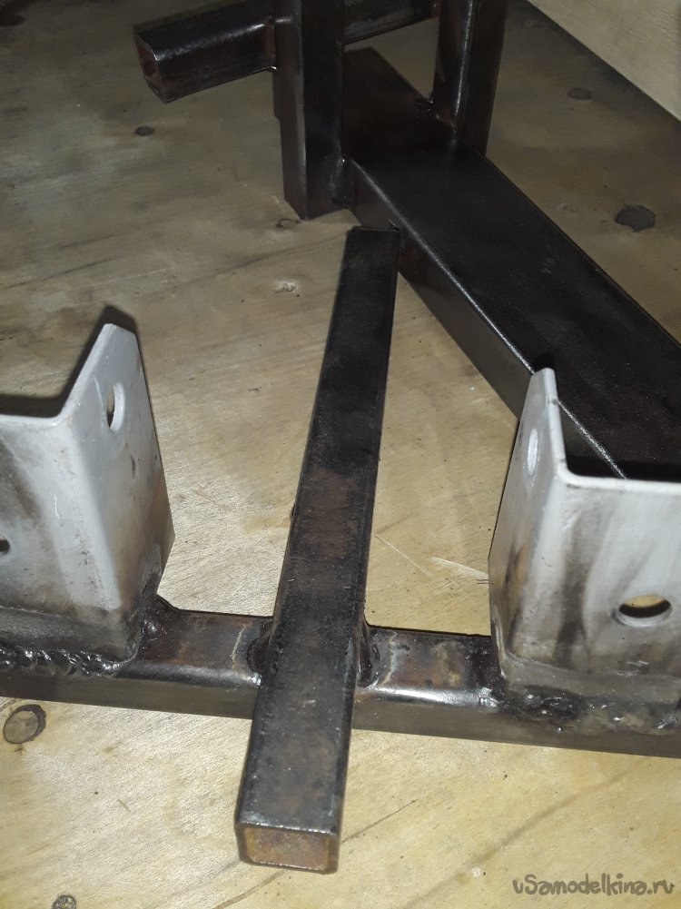 Для станины взял профильною трубу 20 на 40ми длинной 60см со стенкой 1.5мм. Отступил от края 10см просверлил сквозное отверстие потом поставив примерно как будет стоять болгарка и сделал разметку какой длины нужно делать упорную площадку. Взял два отрезка профильной трубы 20 на 20мм 20см длиной и на краю просверлил сквозные отверстия и через болт м10 все стянул потом, приподнял их и сразу на месте на края приварил такой же отрезок 20 на 20мм квадрат. Это получился упор для болгарки он особо ничего не делает, но им можно регулировать угол заточки, а для шлифовки спусков использоваться будет основной упор. Для фиксирования упора отступив от края привариваю на профиль пластину с отверстиями резьбой так с помощью болта производится фиксирования угла упора.