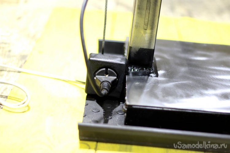 Сделал сначала три витка, но этого мало, поэтому сейчас у меня четыре витка. Крутя ручку, которая приварена к болту, каретка перемещается вверх/вниз. Лучше сильнее натянуть трос.