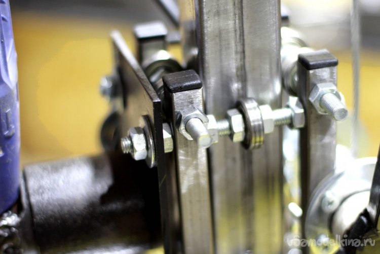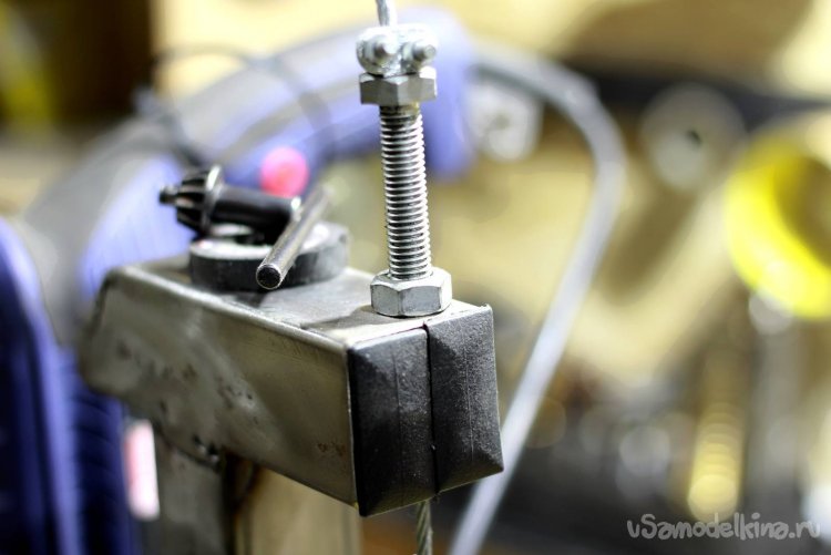 Сама ручка трехлучевая из профильной трубы 15х15, а в качестве штока, на который наматывается трос, удлиненный болт М20. Для натяжения я использовал вертикально просверленный болт М10. Механизм натяжения аналогичен тому, какой был на мопедах.