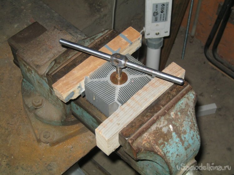 Второй персональный радиатор – от персонального же компьютера (Фото 5) – воздушное охлаждение процессора. Значительная его высота и медная болванка посередине позволили организовать в ней соответствующую резьбу (Фото 6) – спиртовым фломастером отметил центр, тюкнул керном, просверлил отверстие под нарезание резьбы. Через мягкие хвойные деревяшки зажал радиатор в тисках и нарезал резьбу.