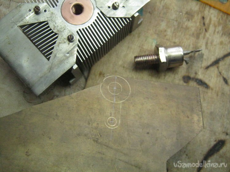 Для надежного и малоомного подключения к анодам тиристоров пришлось изготовить и самодельные лепестки. Из латуни, как металла удовлетворительно работающего в контакте между медью и алюминием. На нашедшейся 2 мм пластине разметил (Фото 10) и выпилил ювелирным лобзиком контуры (Фото 11), меньшее отверстие просверлил, большее также выпилил.