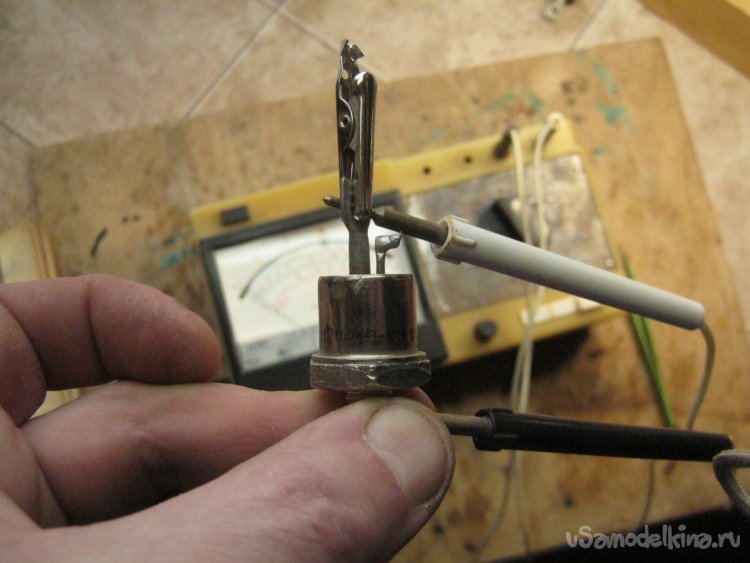 Фото 13. Проверка работоспособности. Следует помнить, что у мощных тиристоров катод сверху. Старые стрелочные Цэ-шки, для таких измерений удобнее современных цифровых приборов.